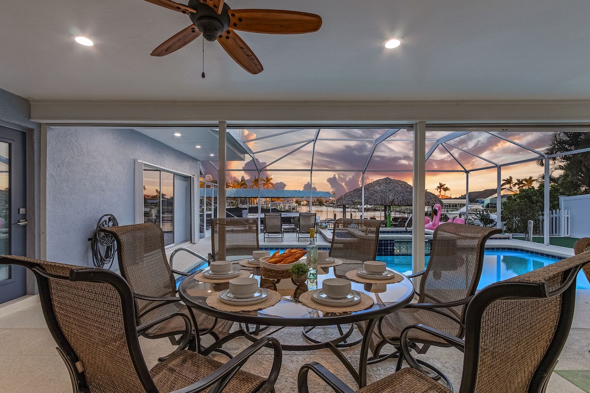 सनी केप कोरलमध्ये तुमचे स्वागत आहे! पॅलाको पॅराडाईजमध्ये, दुपारच्या वेळी लनाईमध्ये सूर्यप्रकाशासह एक अप्रतिम गरम पूलचा आनंद घ्या. फोर्ट मायर्स बीच - बीच गियरकडे 30 मिनिटे ग्रिल आऊट करा, आराम करा किंवा डोके करा! विनामूल्य वॉटरपार्क पाससाठी 4+ रात्री वास्तव्य करा. बॅकयार्डमधून मासे घ्या किंवा तुमच्या स्वतःच्या वैयक्तिक गोदीतून नदीकडे 5 मिनिटांची बोट ड्राईव्ह घ्या! तुम्ही आल्यावर ताजी कॉफी तयार आहे आणि तुम्ही विमानतळापासून फक्त 35 मिनिटांच्या अंतरावर आहात. तुम्हाला आवश्यक असलेली प्रत्येक गोष्ट, तुम्ही काहीही करत नाही - फक्त सूर्यप्रकाश, पाणी आणि शुद्ध विश्रांती!
