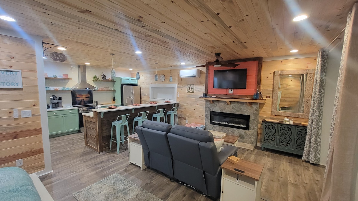6 एकरवर रस्टिक 1 बेडरूम युनिट. सुंदर सूर्यास्तासह तुमच्या दारापासून काही शंभर यार्ड अंतरावर सुंदर खाडी. व्हॉल्टेड लिव्हिंग रूम, ड्युअल रिलिनिंग सोफा, 50 इंच रोकू टीव्ही आणि डिनेट. पूर्ण आकाराचा रेफ्रिजरेटर, मायक्रोवेव्ह आणि क्यूरिग कॉफी मेकरसह किचन. किंग साईझ बेड, उबदार इलेक्ट्रिक फायरप्लेस, 32 इंच रोकू टीव्ही आणि वॉशर/ड्रायरसह कपाट. मैदाने इतर भाडेकरूंसह शेअर केली आहेत. FT Knox-6.2 मैल एलिझाबेथटाउन स्पोर्ट्स पार्क -15 मैल चर्च हिल डाउन्स -36 मैल सीमा ओक डिस्टिलरी -7 मैल