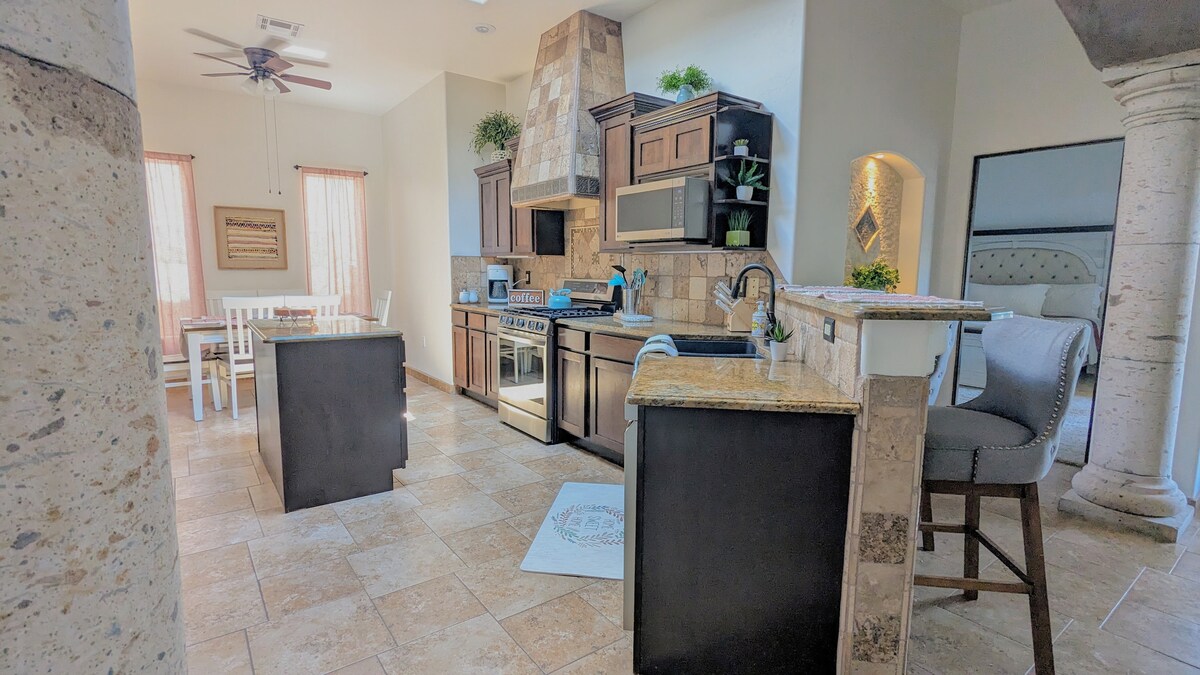 पूलसह 1+ एकरवर पुब्लो स्टाईलचे घर! या मोहक 4BR/2BA Pueblo Style घरामध्ये संपूर्ण अप्रतिम तपशील आहेत. सुंदर लाकडी बीम ॲक्सेंट्स असलेल्या लिव्हिंग एरियामध्ये भव्य सॉल्टिलो टाईल्स आणि उबदार हिवाळ्यातील रात्रींसाठी किवा - शैलीची फायरप्लेस. प्राथमिक सुईट पूल आणि संध्याकाळच्या सनसेट्समध्ये उन्हाळ्याच्या उतारांसाठी कव्हर केलेल्या पॅटीओमध्ये थेट ॲक्सेस देते. चौथी बेडरूम मोठी आहे आणि दुसरी लिव्हिंग एरिया म्हणून वापरली जाऊ शकते. पूल गरम नाही आहे, परंतु तो वर्षभर उघडा आणि स्वच्छ केला जाईल. माफ करा पाळीव प्राणी नाहीत.