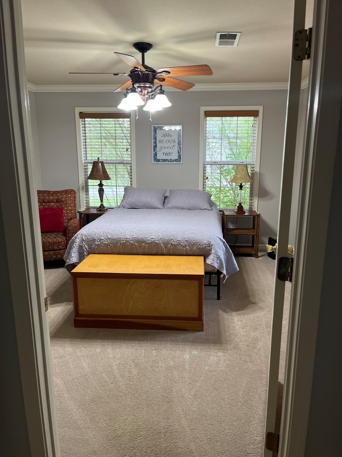उज्ज्वल, आनंदी आणि चकाचक स्वच्छ एक क्वीन बेडरूम ज्यामध्ये पूर्ण किचन आणि दिव्यांगता ॲक्सेसिबल बाथरूम आहे जे मैत्रीपूर्ण कम्युनिटीमधील ऑरगॅनिक फार्मवर आहे. सासू - सासऱ्यांची क्वार्टर्स ही मुख्य घराशी जोडलेली एक खाजगी जागा आहे ज्यात समोर आणि मागे झाकलेले पोर्च आणि पायऱ्या नसलेले खाजगी प्रवेशद्वार आहे. गेस्ट्ससाठी पोर्च आणि ग्रिल उपलब्ध आहेत. आसपासच्या परिसरात आणि फार्मच्या आसपास किंवा तलावापर्यंत राईडच्या विनंतीवर गोल्फ कार्ट उपलब्ध आहे. एका स्पष्ट रात्री, तुम्ही कायमचे तारे पाहू शकता!