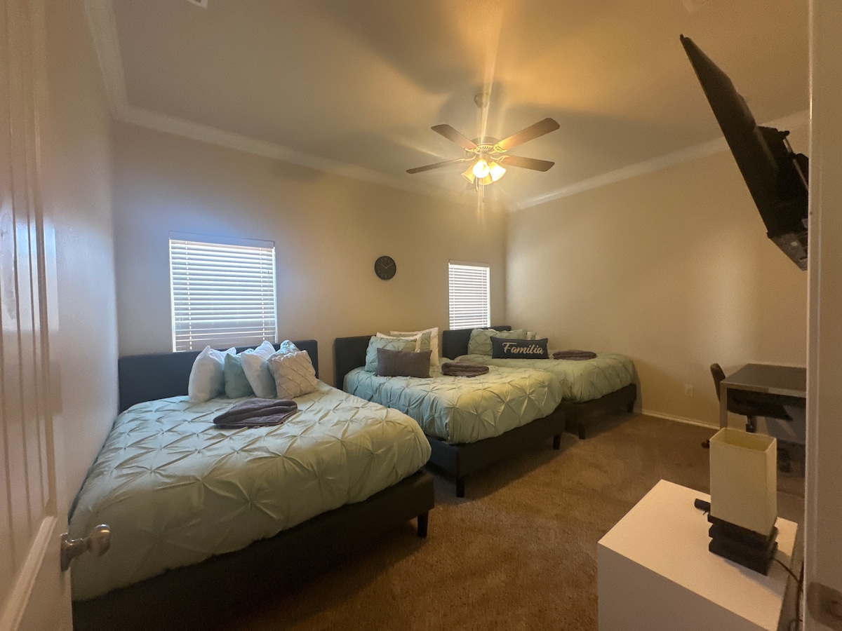 4 बेडरूम (5 बेड्स) प्रत्येक बेडरूममध्ये फ्लॅट स्क्रीन रोकू टीव्ही, 2 बाथ, 2 लिव्हिंग एरिया (पिंग पाँग टेबलसह 1 गेम रूम), वर्कशॉप (वीजेसह), कव्हर्ड पॅटिओ आणि बार्बेक्यू पिटसह मोठे बॅकयार्ड आणि डाउनटाउनच्या जवळ. आरओ पाण्यासह अद्ययावत किचन. शहरात येणाऱ्या मोठ्या ग्रुपसाठी किंवा कार्यकारी अधिकाऱ्यांसाठी आणि कामाच्या जागेची गरज असलेल्यांसाठी योग्य जागा.