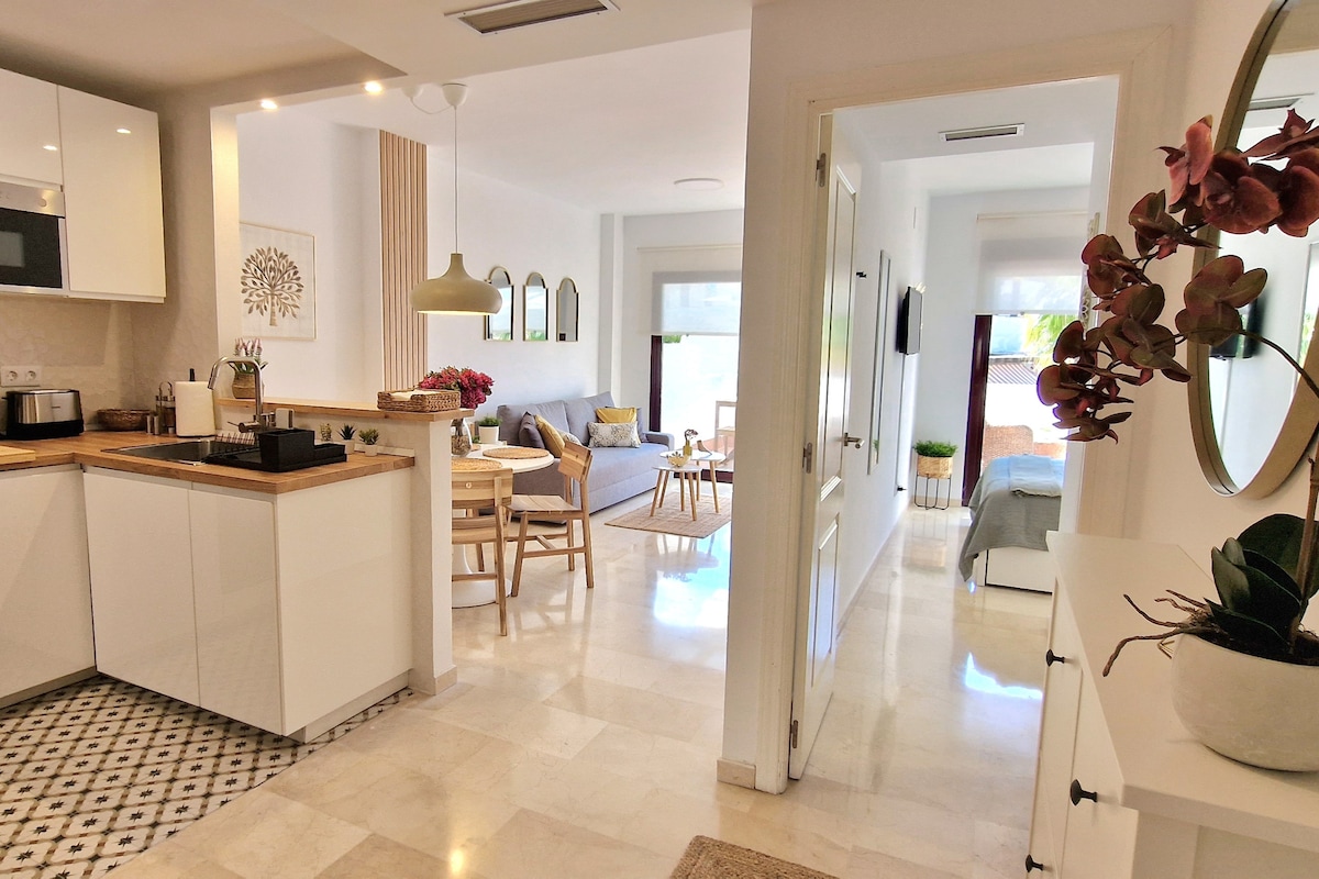 A la hora de dise├▒ar y decorar el alojamiento, se configuro como una gran suite donde los hu├йspedes puedan disfrutar del m├бximo confort y detalle, sentirse en un hogar con la independencia que ello conlleva y con todas las comodidades que ofrece una casa. El prop├│sito final no es otro que los hu├йspedes tengan un recuerdo imborrable de su estancia. Toda la decoraci├│n ha sido muy estudiada, para que sea un lugar verdaderamente privilegiado, donde he dado cabida a parte de mis viajes, pues se han colgado cuadros tra├нdos de Bali, tapices y telas de Camboya, y todo ello mezclado con muebles y objetos que he ido adquiriendo durante a├▒os de diferentes lugares y sitios, dando lugar a una mezcla muy especial, en un ambiente ├║nico y que le da un magnetismo exclusivo al lugar. Concretamente se trata de un apartamento, situado en la localidad de Marbella, en la exclusiva zona denominada Golden Mile, cercana a alojamientos tan exclusivos como el hotel Puente Romano y el Hotel Marbella Club. El apartamento, de un dormitorio, cuenta con capacidad para cuatro personas, una cama principal en el dormitorio y un sof├б cama en el sal├│n, esta conceptuado o bien para una pareja o para una pareja con uno o dos ni├▒os,que quieran disfrutar de una estancia tranquila, en una zona residencial y exclusiva, cercana a todas las ├бreas de inter├йs de la localidad de Marbella, cuenta con una terraza de 44 metros cuadrados con vistas a la iconica y emblem├бtica monta├▒a de Marbella "La Concha". El apartamento est├б dentro de un conjunto residencial, de pocas casas contando con sistema de videovigilancia y zonas comunes de jard├нn y una piscina de tama├▒o considerable, en funci├│n al n├║mero total de vecinos. En definitiva, es un lugar situado en un mar de tranquilidad y desconexi├│n a poca distancia, de todo lo que ofrece un lugar como Marbella. Complejo conformado por 28 casas, con gran privacidad, c├бmaras de seguridad en las zonas de acceso y comunes, aparcamiento para 2 coches, piscina con jardin y zona de hamacas, que cuenta habitualmente con poca confluencia de personas, al no contar con muchos vecinos, conserje. Con f├бcil acceso al recinto de los conciertos de Starlite, as├н como a las zonas de ocio y restauraci├│n mas selectas o reconocidas de Marbella (Restaurante La Meridiana, Bibo de Dani Garcia; Trocadero Playa, Hotel Puente Romano, Marbella Club, Restaurante Sol y Luna) (Discoteca Olivia Valere, Finca Besaya, Funky Bhuda) Atenci├│n personalizada. Al contar con amplios conocimientos de Marbella y alrededores. Podemos facilitar informaci├│n relativa a todas aquellas posibles actividades que se quieran realizar, ocio, deportes, actividades culturales, playas, restaurantes, supermercados, zona de compras, visitas que realizar. Esta urbanizaci├│n, magn├нficamente ubicada equidistante entre la Ciudad de Marbella y Puerto Ban├║s, justo enfrente del Hotel Puente Romano, en el coraz├│n de la Milla de Oro. Las Lomas constituye un oasis de tranquilidad que pocas urbanizaciones disfrutan hoy d├нa. Los complejos residenciales m├бs importantes de Marbella est├бn ubicadas dentro o junto a Las Lomas del Marbella Club. Con f├бcil acceso a la autov├нa y a la autopista (a 1 min en coche) lo cual facilita mucho la log├нstica. A menos de 5 minutos en coche del centro comercial La Ca├▒ada, el m├бs grande de Andaluc├нa, donde encontr├бs tiendas espectaculares, cines y restaurantes de todo tipo y para todos los gustos. Principalmente en coche privado, aunque cuenta con todos los servicios a poca distancia (supermercados, restauraci├│n y ocio). No obstante, es recomendable contar con veh├нculo propio, para poder moverse y para conocer Marbella, sus zonas y alrededores. Con f├бcil acceso desde la autovia, salida Nagueles. Desde Marbella, por el hotel Puente Romano, direcci├│n Mezquita. La entrada a Las Lomas es a trav├йs un magn├нfico arco, situado justo encima de la Mezquita en el camino hac├нa el Restaurante La Meridiana. Hay dos entradas m├бs que se pueden encontrar frente a Olivia Val├иre en la Carretera de Ist├бn y a trav├йs del Camino de los Manchones, que da acceso a las zonas de Marbella Hill Club, Marbella Sierra Blanca, Nag├╝eles y Camoj├бn. A menos de 5 minutos en coche del centro comercial La Ca├▒ada, el m├бs grande de Andaluc├нa, donde encontr├бs tiendas espectaculares, cines y restaurantes de todo tipo y para todos los gustos. Pueden alojarse 2 menores de 10 a├▒os de edad dentro del precio establecido. PARA ESTANCIAS IGUAL O INFERIOR A TRES NOCHES: Tercer y cuarto hu├йsped adicional mayores de 10 a├▒os: 20 euros por persona y noche.