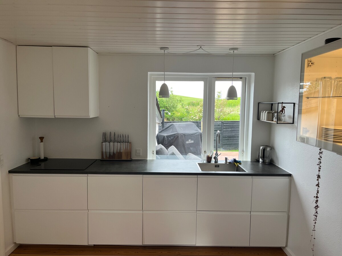 शांत ग्रामीण परिसरात आणि अतिशय सुंदर दृश्यांसह नवीन आणि स्वादिष्ट बेड आणि बाथ. Bjerager Bed & Bath मध्ये आपले स्वागत आहे, जी एक नवीन सुरू झालेली कंपनी आहे ज्यात एक नवीन सजवलेले 2 बेडरूमचे अपार्टमेंट आहे जे अगदी नवीन बांधलेल्या काळ्या लाकडी घरांपैकी एका खाजगी घरात आहे. स्वतंत्र खाजगी प्रवेशद्वार आणि शेतांच्या दृश्यासह मोठ्या सुंदर लाकडी टेरेसचा प्रवेश आणि हंगामांच्या बदलांचे जवळून अनुसरण करण्याची संधी. घरासमोरच्या दरवाजाजवळ पार्किंग आणि की बॉक्ससह स्वतःला लॉक करण्याची संधी.