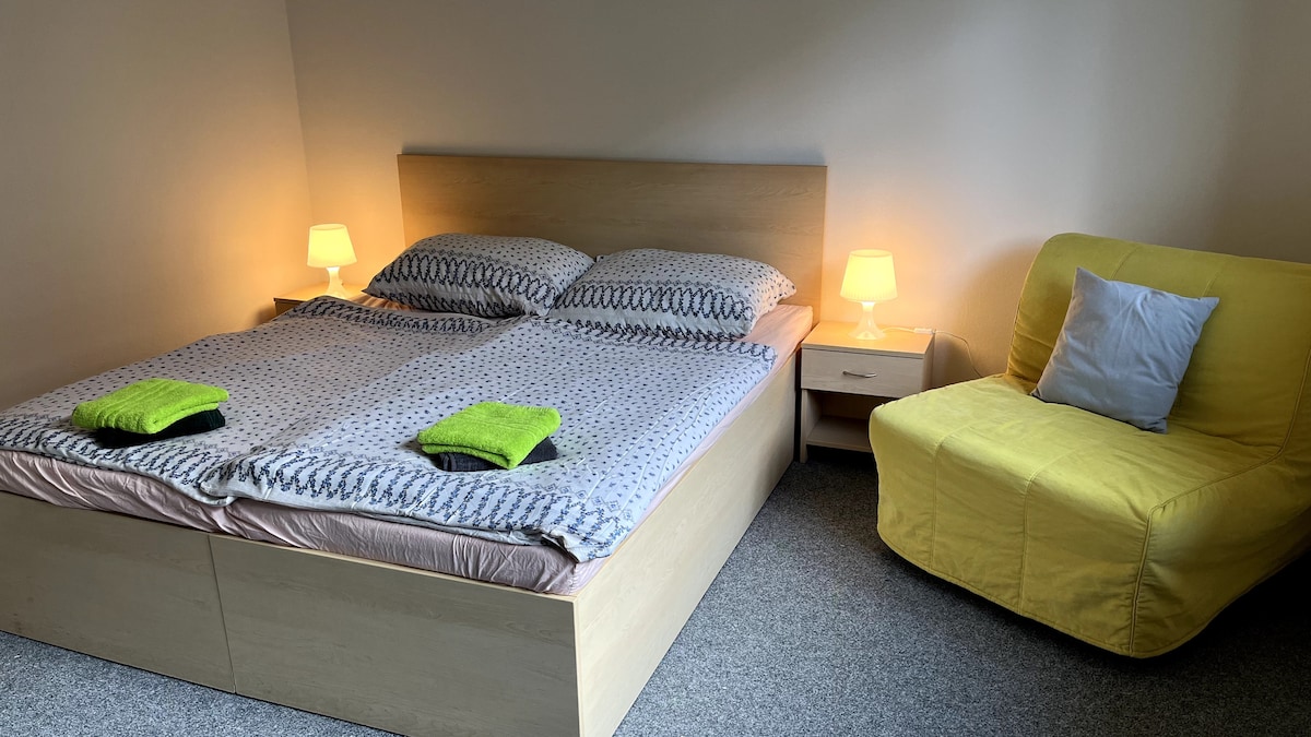 हे शहराच्या मध्यभागी, बस स्टॉप, डी 1 च्या प्रवेशद्वार, विमानतळ, औद्योगिक क्षेत्र "चेर्नोविक टेरेस" च्या जवळ आहे. सुंदर दृश्य. शांतता आहे, अंगणात आणि बाल्कनीवर बसण्याची जागा आहे, आरामदायक बेड्स आहेत, कुंपण घातलेल्या अंगणात पार्किंगची सुविधा आहे. एकट्या प्रवाशांसाठी, व्यावसायिक प्रवासासाठी आणि मुलांसह कुटुंबांसाठी निवास उत्तम आहे. निवास स्थान जास्तीत जास्त 3 प्रौढांसाठी किंवा 2 प्रौढ आणि 2 मुलांसाठी आहे, जेथे 1 मूल लिव्हिंग रूममध्ये सोफ्यावर झोपू शकते.