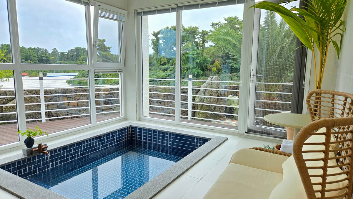 हे एक जेजू घर आहे ज्यात 130 - प्योंग प्लॉटवर हिरवा लॉन यार्ड, लाकडी डेक आणि लाकडी डेकवर गुलाबी ड्रेस आहे. हिरव्या लॉन यार्डमध्ये, टँगेरीनच्या झाडाशेजारी एक सूर्यप्रकाशाने भरलेला आणि आरामदायक हॅमॉक आहे, सूर्यप्रकाशात आराम करण्यासाठी एक हॅमॉक आहे, कुटुंब आहे आणि तुमच्या प्रियकराबरोबर आग लावण्यासाठी एक ब्राझियर आहे. लाकडी डेकवर एक बार्बेक्यू ग्रिल आणि स्विंग चेअर आहे जिथे तुम्ही आराम करू शकता आणि तुमच्या कुटुंबासह जेवणाचा आनंद घेऊ शकता. जर तुम्ही फक्त जेजूमध्ये दिसणारे ढग पाहिले आणि जे फक्त जेजूमध्येच दिसू शकतात, आरामदायक खुर्चीवर झुकलेले, ते खरोखर बरे करणारे आहे. जवळपास गोटजावाल आणि टँगरीन फील्ड्स आहेत, त्यामुळे तुम्ही सर्व ऋतूंमध्ये पक्ष्यांच्या आवाजात दिवस घालवू शकता. पांढऱ्या रंगाच्या भिंती, अकेसिया आणि मल्बाऊमुळे जागा थोडी उबदार आणि अधिक उबदार बनते. घराच्या आत अनेक खिडक्या आहेत, लिव्हिंग रूममधील उंच छत आनंददायक आहे आणि व्यवस्थित आतील भाग दिवसभर घरात राहण्यासाठी पुरेसा आहे. आर्केड आणि बोर्ड गेम्ससारखे हवामान चांगले नाही, त्यामुळे तुमच्याकडे राहण्यासाठी भरपूर वेळ असू शकतो आणि पूल आणि फायरप्लेस एकट्या पूल आणि फायरप्लेससह अधिक खाजगी आहेत.