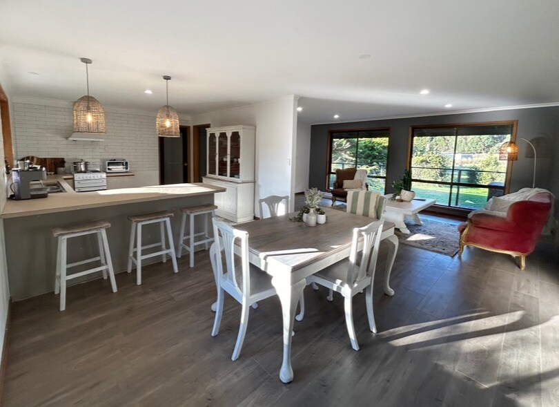 Escape to a serene six-hectare country haven. Enjoy garden views of paddocks and bushland. The guesthouse, separate from the main home, offers modern country charm with hardwood floors. Relax in a well-equipped kitchenette, air-conditioned living area, and two bedrooms—queen and singles. The bathroom features extra towels and laundry. Unwind by the wood fire heater in the entrance room with a writing desk.