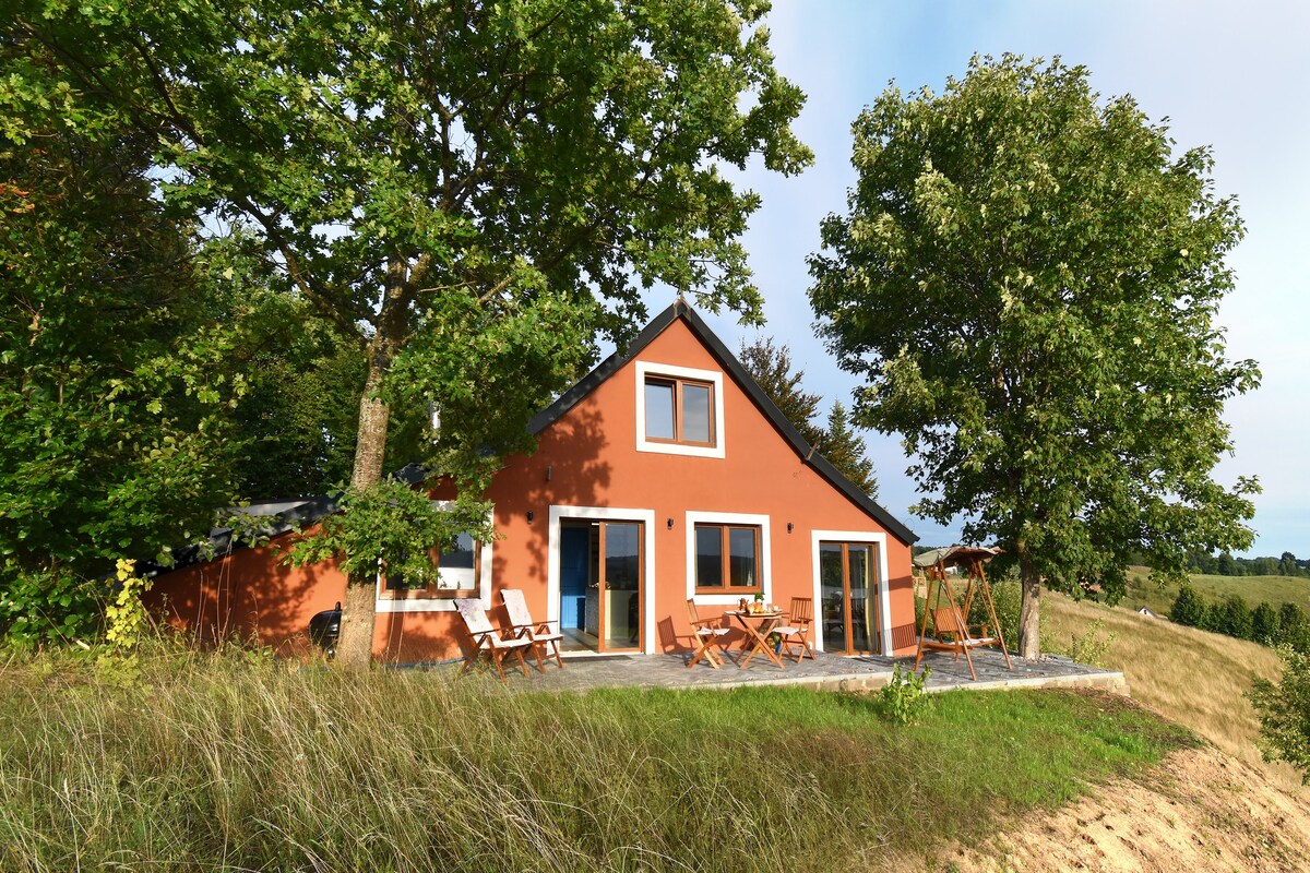 आम्ही तुम्हाला ज्या सुविधेसाठी आमंत्रित करतो ती एक नवीन स्वतंत्र, आधुनिक, 2 - बेडरूम आहे ज्यात लिव्हिंग रूम आणि किचन आहे,पूर्णपणे सुसज्ज, आरामदायक घर आहे, जे वेगळ्या, मोठ्या , सुंदर सुव्यवस्थित प्लॉटवर आहे. हे एक विलक्षण, मोहक ठिकाण आहे, जे हिरवळीने चारही बाजूंनी वेढलेले आहे. तलावाच्या अगदी स्वच्छ (1 स्वच्छता वर्ग) किनाऱ्यापासून 800 मीटर अंतरावर असलेल्या प्लॉटचा आकार - 180 मीटर. तलावाच्या किनाऱ्यावर चालत असताना (5 मिनिटे) आम्हाला मोठ्या जेट्टीसह एक सांप्रदायिक आंघोळीचे क्षेत्र दिसेल. कॉटेजमधून दिसणारे दृश्य थेट जंगलावर आहे.
