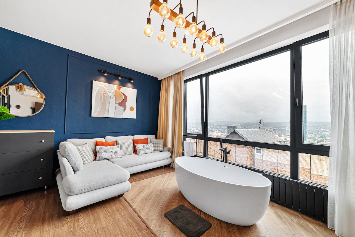 INDUSTRIAL Apartmant in old soviet building designed by "VIRSTAK", brings unique atmosphere with spectacular day and night CITY VIEW enjoyable from the BATHTUB. - Apartment 100% HANDMADE. - Not a RANDOM cozy/ functional apartment, more artistic making you feel like in movies. OFFERING: - WINERY with 9 SORTS of wine, bottled by "Chateau GREMI" ! - PROJECTOR for MOVIE nights included in price ! - Free Meama coffeeshop capsules for two ! Airport pickup - eco- Suzuki Swift 60 gel