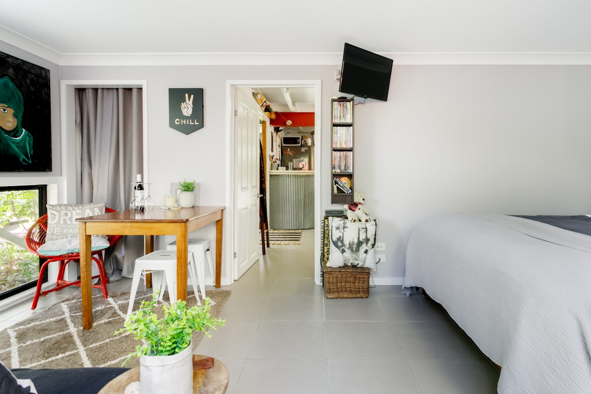 या स्वयंपूर्ण घराशी जोडलेल्या पूल आणि कव्हर केलेल्या बार्बेक्यू क्षेत्रासह बालीनीज - प्रेरित बागेत झाकलेल्या लाकडी डेबेडवर आराम करा. गेस्ट सुईटमध्ये क्वीन बेड आणि 2 सोफा - बेड्ससह स्वतःचे स्वतंत्र प्रवेशद्वार आहे. एक पूल टेबल देखील आहे. गेस्ट्सना पूल आणि बार्बेक्यू क्षेत्र तसेच रुम्पस रूम आणि खालच्या मजल्यावरील बसण्याच्या जागा वापरण्यासाठी स्वागत आहे. स्विमिंग पूल आणि बार्बेक्यू क्षेत्र. गेस्ट्स टेक्स्ट किंवा ईमेलवर फोन करू शकतात, आम्ही वरच्या मजल्यावर राहतो आणि गेस्ट्सना गार्डन्स आणि खालच्या मजल्यावरील जागेचा ॲक्सेस असेल. हे घर कोल्स, वूलवर्थ्स आणि अल्डी किराणा दुकानासह मुदगेराबाच्या अनोख्या छोट्या गावात आहे. हे रॉबिना टाऊन सेंटरपासून एक लहान ड्राईव्ह आहे, जे रेल्वे स्टेशन आणि रुग्णालय प्रदान करते आणि कुलांगट्टा विमानतळापासून 20 मिनिटांच्या अंतरावर आहे. आजूबाजूला फिरण्यासाठी कार हा सर्वोत्तम मार्ग आहे. रॉबिना रेल्वे स्टेशन 5 मिनिटांच्या ड्राईव्हवर किंवा 25 मिनिटांच्या अंतरावर आहे. आमचे घर पाळीव प्राण्यांसाठी अनुकूल आहे आणि तुमच्या चार पायांच्या फररी मित्राचे स्वागत आहे. जोपर्यंत ते चांगले वागतात आणि इतर कुत्र्यांसह चांगले असतात कारण आमच्याकडे दोन लहान कुत्रे देखील आहेत.
