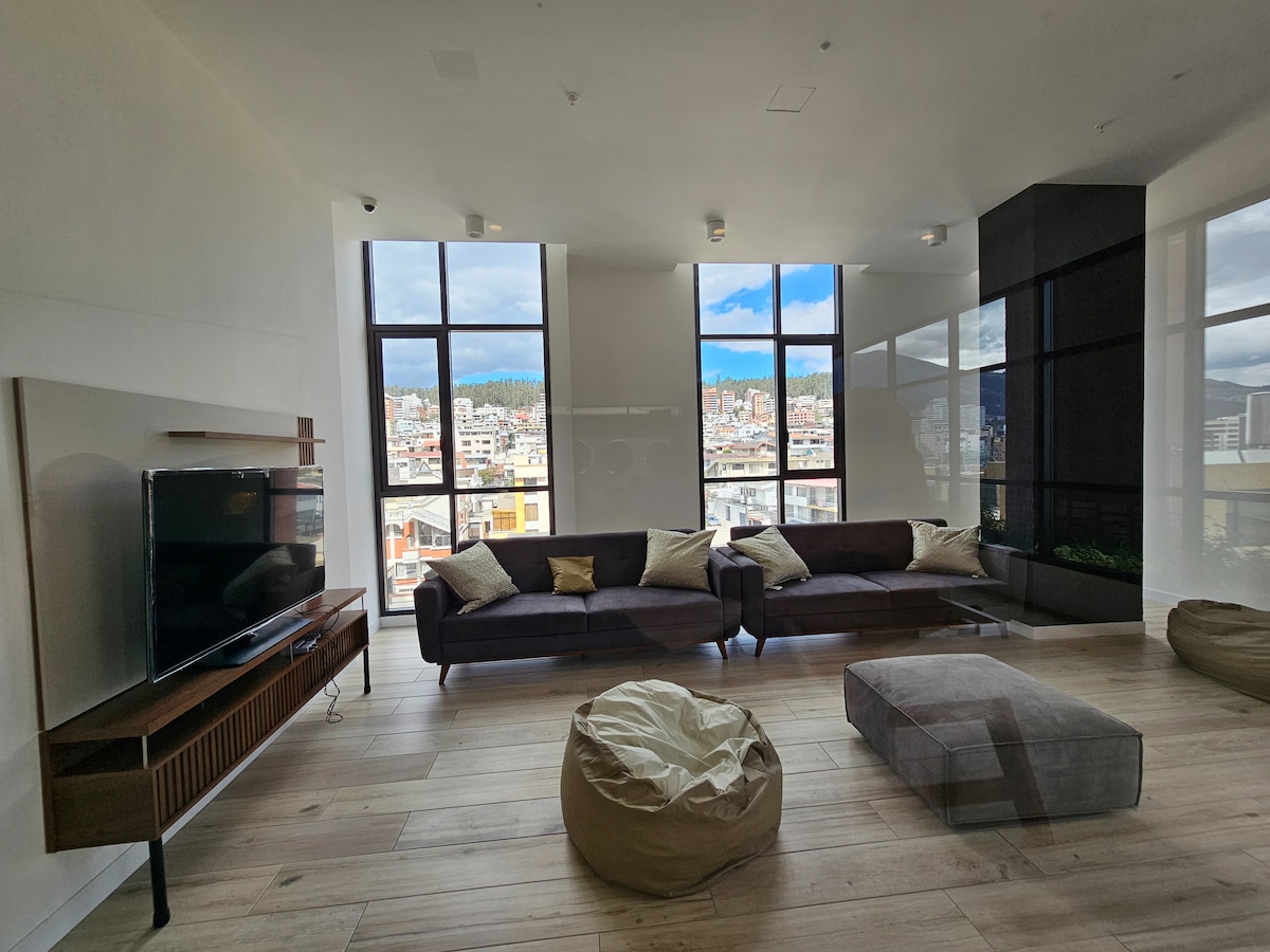 एका नवीन आणि अवांछित गार्डन इमारतीच्या 20 व्या मजल्यावर असलेल्या आमच्या अद्भुत लक्झरी सुईटमध्ये तुमचे स्वागत आहे! हे उंचीचे ओझिस तुम्हाला प्रथम श्रेणी सुविधा (काही विनामूल्य वापरासाठी आणि काही बुकिंगद्वारे) प्रदान करण्यासाठी डिझाइन केलेले आहे. ग्रिल प्रेमींसाठी, आमच्याकडे क्विटोच्या 360 व्ह्यूजसह बार्बेक्यू क्षेत्र आहे आणि त्यांच्या पाळीव प्राण्यांसह प्रवास करणाऱ्या लोकांना आम्ही पाळीव प्राण्यांसाठी अनुकूल आहोत हे जाणून आनंद होईल. आमच्याकडे अतिरिक्त शुल्कासाठी विविध उत्पादने आणि पेयांसह स्नॅक बार देखील आहे