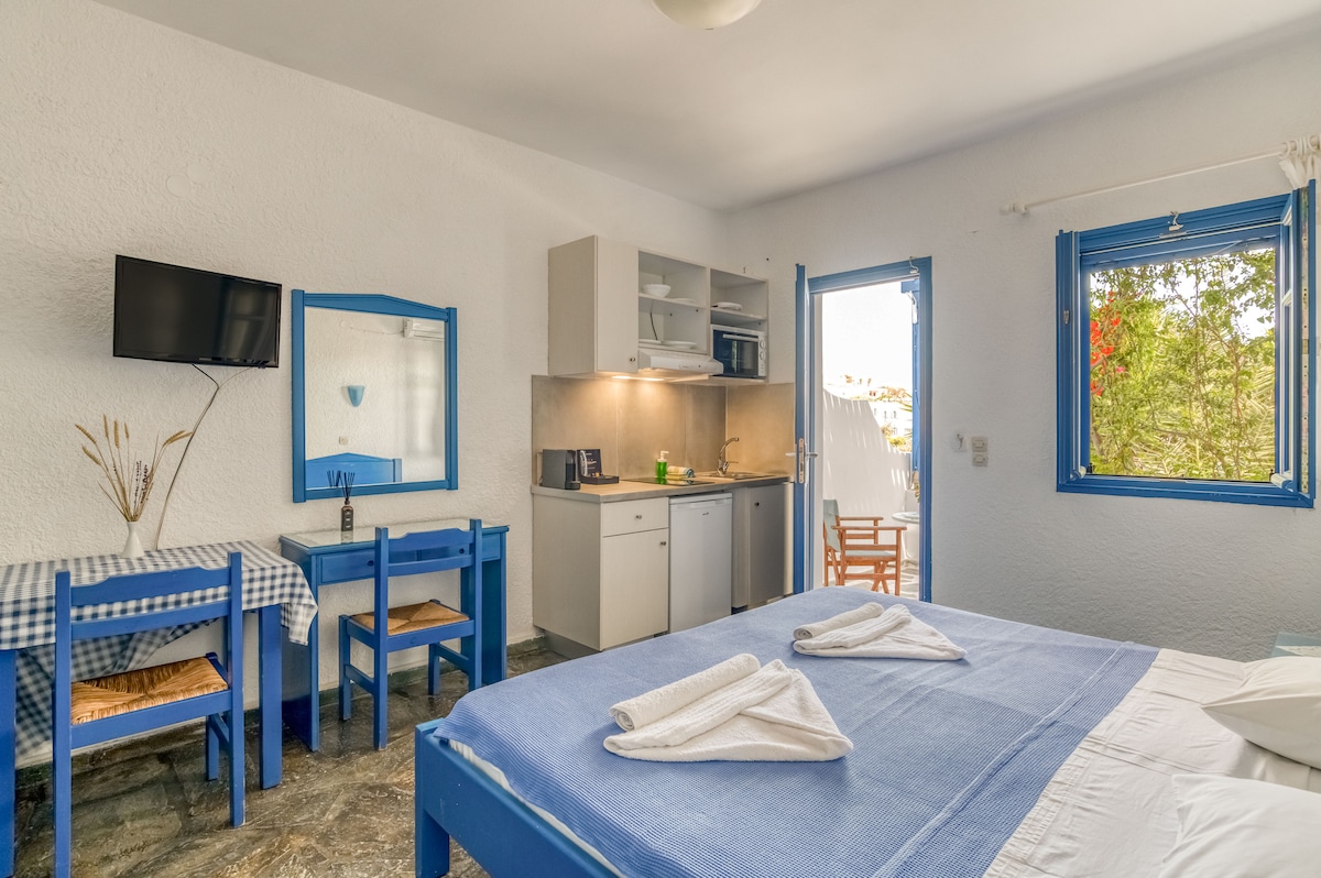 एडाचे अपार्टमेंट हे बोगेनविलिया आणि सायप्रसच्या झाडांनी वेढलेल्या शांत जागेच्या मध्यभागी असलेले एक खाजगी अपार्टमेंट आहे. अपार्टमेंट सिक्लॅडिक प्रकाराचे आहे आणि नुकतेच नूतनीकरण केलेले, 270 चौरस फूट रूममध्ये पूर्णपणे सुसज्ज किचन (एअर कंडिशनर, फ्रिज, ओव्हन, टीव्ही, वॉशिंग मशीन इ. आणि पूर्णपणे सुसज्ज बाथरूम) आहे. 645 चौरस फूटच्या सुंदर आणि आऊटडोअर व्हरांडाचा उल्लेख करायला विसरू नका जिथून तुम्ही पॅनोरॅमिक व्ह्यू पाहू शकता आणि अप्रतिम सूर्यास्त आणि पक्षी किंचाळताना पाहू शकता!