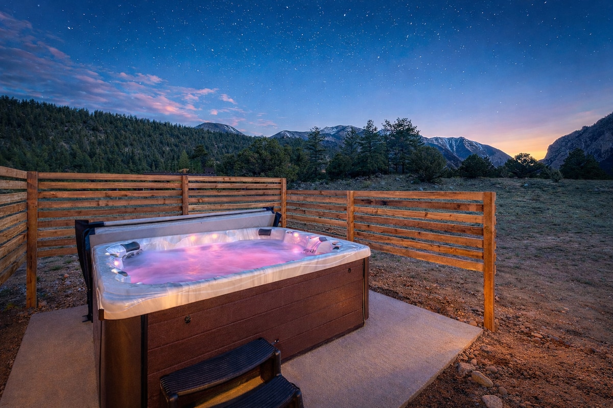 संपूर्ण शांती आणि निसर्गाबरोबर एक. केबिनमधून दिसणारे रस्ते नाहीत, ड्राईव्हवेशिवाय. सुंदर धबधबा, हायकिंग ट्रेल्स आणि 14er (माऊंटन) च्या मागील दरवाजाचा थेट ॲक्सेस. प्रिन्स्टन). पर्वत आणि वन्यजीवांचे अप्रतिम दृश्ये. प्रॉपर्टीमधून वाहणारा झरा ऐका. वाळवंटाच्या मध्यभागी, परंतु सुविधांच्या जवळ. वरील कोट्यवधी स्टार्सच्या नजरेत लाऊंजर ऑफ बॅक डेकसह हॉट स्प्रिंग्स ब्रँडच्या खाजगी हॉट टबमध्ये तुमचा थकलेला स्वभाव आराम करा. सीटसह फायरपिट (स्वतःचे फायरवुड आणा).