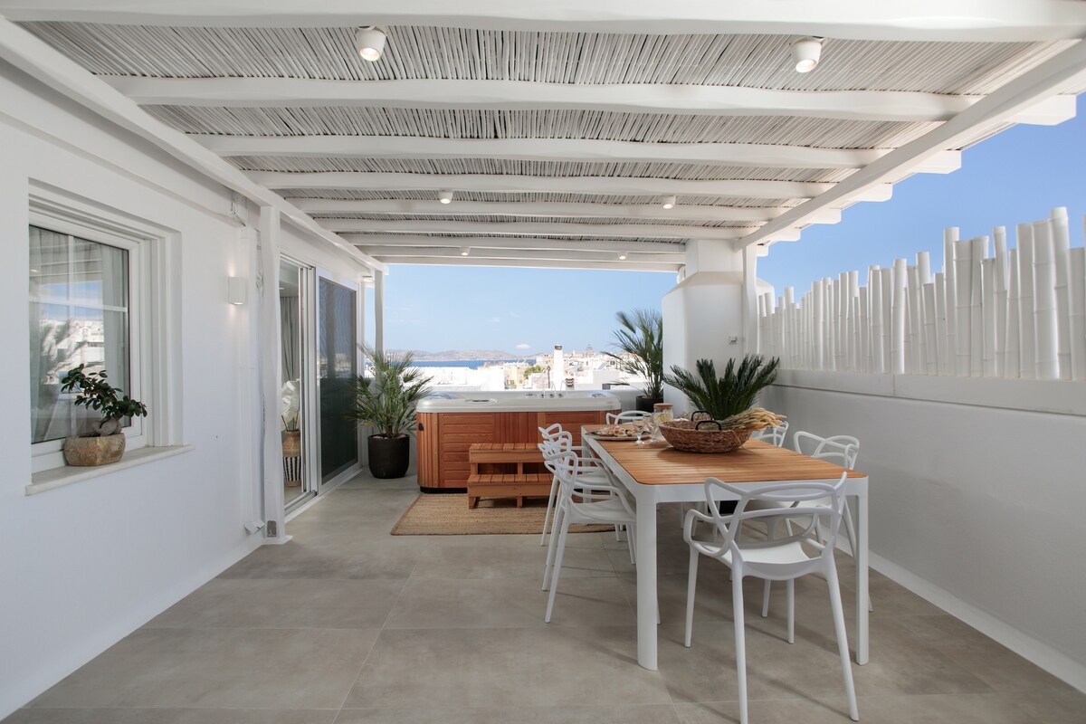 एजियन समुद्राच्या अप्रतिम दृश्यांसह नाक्सोस टाऊनमध्ये वसलेले आम्ही गेस्ट्सना आरामदायक अनुभवाची अनोखी संधी देतो. बेटाच्या प्रसिद्ध पोर्टारा आणि व्हेनेशियन किल्ल्यापासून सहज पोहोच. आमचे तत्वज्ञान म्हणजे अतुलनीय गोपनीयतेसह प्रथम श्रेणीचे आदरातिथ्य करणे. आमच्या डिलक्स सुईटमध्ये मोहक शैली आणि अनोख्या ग्रीक आदरातिथ्यासह सर्वोच्च आरामदायी वातावरण आहे. कमीतकमी लाईन्समुळे आरामदायक वातावरण तयार होते.