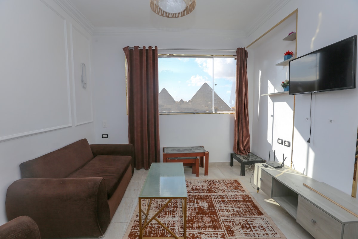 This apartment is located at only 5 min by walk from the Sphinx and Pyramids entrance gate with view of the pyramids from balcony , are in a quiet location close to many restaurants, shops, fruit shops, mall shop (local and touristic), mini markets, and pharmacies, Apartment is air conditioned, unlimited fast internet , Full accessories clean sheets, fresh towels & quite atmosphere. Its probably the best place to enjoy pyramids view