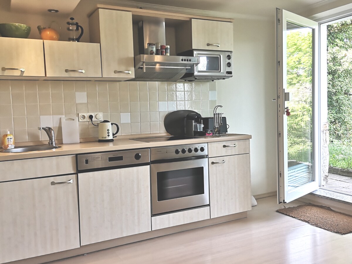 ग्रुंडरझिटविल्लामधील अप्रतिम गार्डन अपार्टमेंट (110sqm) - आदर्श आणि शांत लोकेशन. अपार्टमेंट कुत्रे मालक आणि 4 पायांचे स्पष्टपणे स्वागत करते. दोन लोकांसाठी आदर्श/ शक्यतो अधिक 1 प्रौढ किंवा 2 मुले (सोफा बेड) गार्डन ज्यामध्ये विविध बसण्याची जागा आणि बार्बेक्यू वापरले जाऊ शकतात. शहराच्या मध्यभागी एक नासिकाशोथ. मुख्य रेल्वे स्टेशनपासून चालत चालत, A66 पासून 5 मिनिटे, विमानतळापासून 20 मिनिटे, फ्रँकफर्टपासून 25 मिनिटे, परंतु कोणाला निघायचे आहे - कारण ऱ्हिंगो दरवाज्यावर आहे