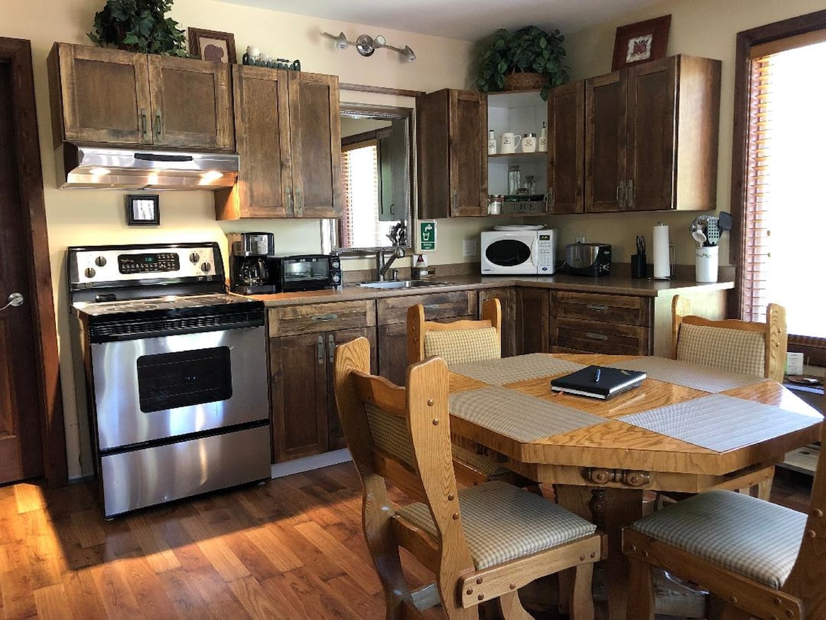 Welcome to our bright and cozy studio suite. Central to all amenities such as restaurants, shopping, casino, ski hills, and access to U.S.A. border. Our unit includes: 1 queen bed (twin air mattress can be provided with a fee),seating area, 3 piece washroom, tvs with 3 streaming services, kitchenette with induction burner and pans, airfryer/toaster oven, microwave, dishes, cooking essentials, coffee & tea bar, snacks/breakfast items, outdoor seating, and free driveway parking for 1 vehicle.