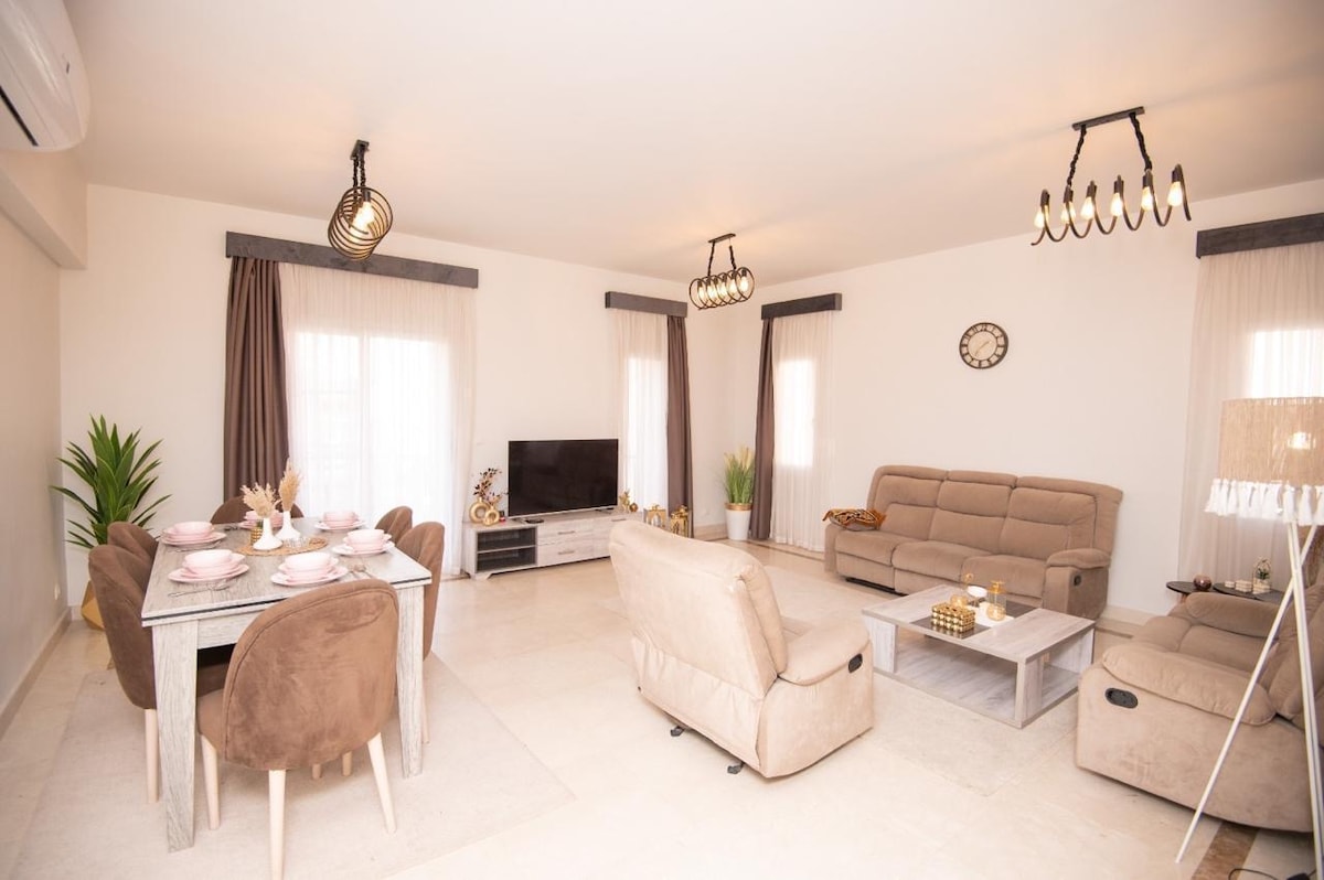 इजिप्तच्या न्यू कैरोमधील सर्वात खास कंपाऊंड्सपैकी एक असलेल्या उत्कृष्ट सुट्टीसाठीचे घर. हे सुपर लक्झरी पूर्णपणे सुसज्ज अपार्टमेंट जास्तीत जास्त सहा गेस्ट्ससाठी योग्य आहे आणि न्यू कैरोच्या 5 व्या सेटलमेंटच्या मध्यभागी असलेल्या मिडवा कंपाऊंडमधील खाजगी गार्डनचे फायदे आहेत. कॅफे, रेस्टॉरंट्स आणि इतर सुविधांनी वेढलेल्या पूल, जिम आणि सुंदर तलावाजवळील दृश्यांचा ॲक्सेस करण्याव्यतिरिक्त गेस्ट्सना त्यांच्या बुकिंगच्या कालावधीसाठी अपार्टमेंटचा संपूर्ण वापर असेल.