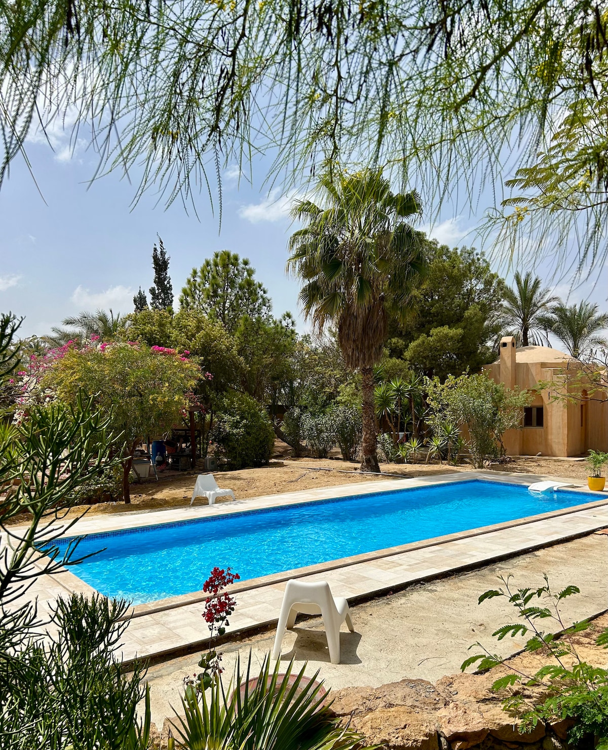 आमचे कॉटेज हे वाळवंटातील देशांसाठी एक न्युबियन शैलीचे बांधकाम आहे जे केंद्रापासून 25 मिनिटांच्या अंतरावर आणि विमानतळापासून 20 मिनिटांच्या अंतरावर असलेल्या एका विशाल कॅरफोर शॉपिंग सेंटर रेस्टॉरंट्स आणि सिनेमापासून 7 मिनिटांच्या अंतरावर आहे.