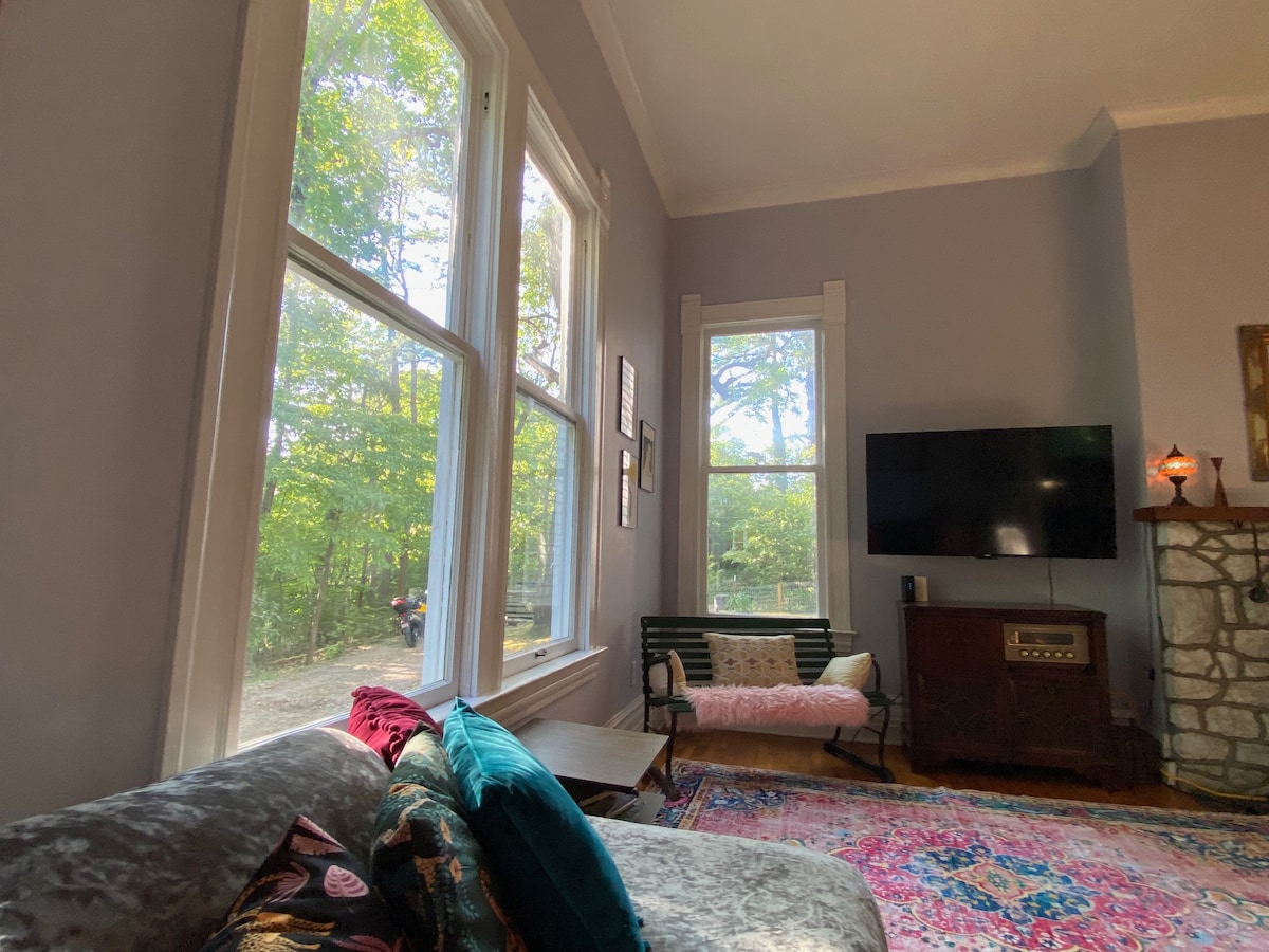 500 चौरस फूट केबिन, जे एकाकी वाटते परंतु मुख्य रस्त्याच्या अगदी जवळ असलेल्या जुन्या आसपासच्या भागात आहे जे तुम्हाला डाउनटाउनमध्ये घेऊन जाते आणि प्रॉपर्टीला स्वतंत्र रेंटल घर आणि अपार्टमेंटसह (केबिनपासून 100 फूट) शेअर करते. पार्किंग मर्यादित आहे आणि इतर गेस्ट्ससह शेअर केले आहे. खूप अरुंद सर्पिल जिना (2 फूट). हॅमॉक खुर्च्यांवर 200lb वजनाची मर्यादा. आम्ही प्रवास विमा खरेदी करण्याची शिफारस करतो, विशेषत: हिवाळ्याच्या महिन्यांत. स्थानिक नाहीत.