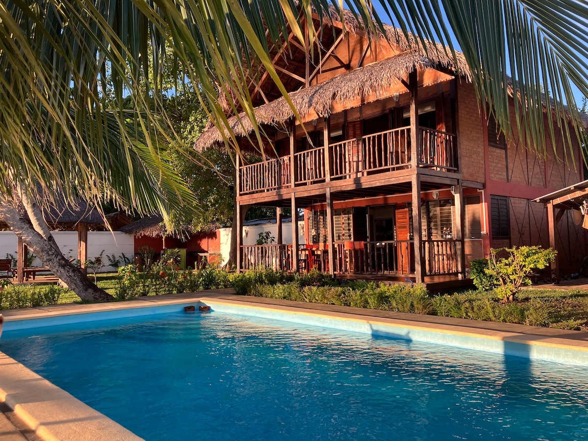 भव्य Ecolodge of Exception पूर्णपणे खाजगी आणि विशेष. जोडपे, कुटुंब किंवा मित्रांच्या छोट्या ग्रुपसाठी आदर्श. 450 मीटर्सचे आर्किटेक्चरल डिझाईन त्याच्या प्रकारची आणि स्वास्थ्य याची खात्री आहे! प्रशस्त, विशाल, परिष्कृत मालागासी सजावट, अतिशय मोकळ्या जागांसह अविश्वसनीय पॅनोरॅमिक समुद्राचे दृश्य. लिंबर्सने वसलेल्या रेनफॉरेस्टच्या मध्यभागी असलेल्या विशाल ज्युरासिक खडकांच्या मध्यभागी मौल्यवान लाकूड आणि नैसर्गिक दगडांनी बांधलेले.