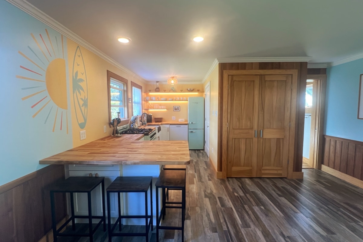 नव्याने नूतनीकरण केलेल्या या सर्फर्सच्या नंदनवनाचा आनंद घ्या! मोठे कुंपण असलेले अंगण लहान मुलांसाठी आणि पाळीव प्राण्यांसाठी योग्य आहे आणि बेटाच्या सर्वोत्तम दुकाने, रेस्टॉरंट्स, कॉफी आणि सूर्यास्ताच्या दृश्यांपासून चालत अंतरावर आहे. दोन बेडरूम्स एकाधिक झोपण्याच्या व्यवस्था सामावून घेण्यासाठी प्रशस्त आणि बहुमुखी आहेत आणि रेट्रो किचनमध्ये कुकिंगसाठी पुरेशी जागा आहे. आरामदायी लाउंजिंग आणि डायनिंग, आतून आणि बाहेरून, आणि संपूर्ण बाथरूम आणि आऊटडोअर शॉवर त्या बीचवरील बम्स स्वच्छ ठेवतात. हे एक बेट स्वप्न सत्यात उतरले आहे!