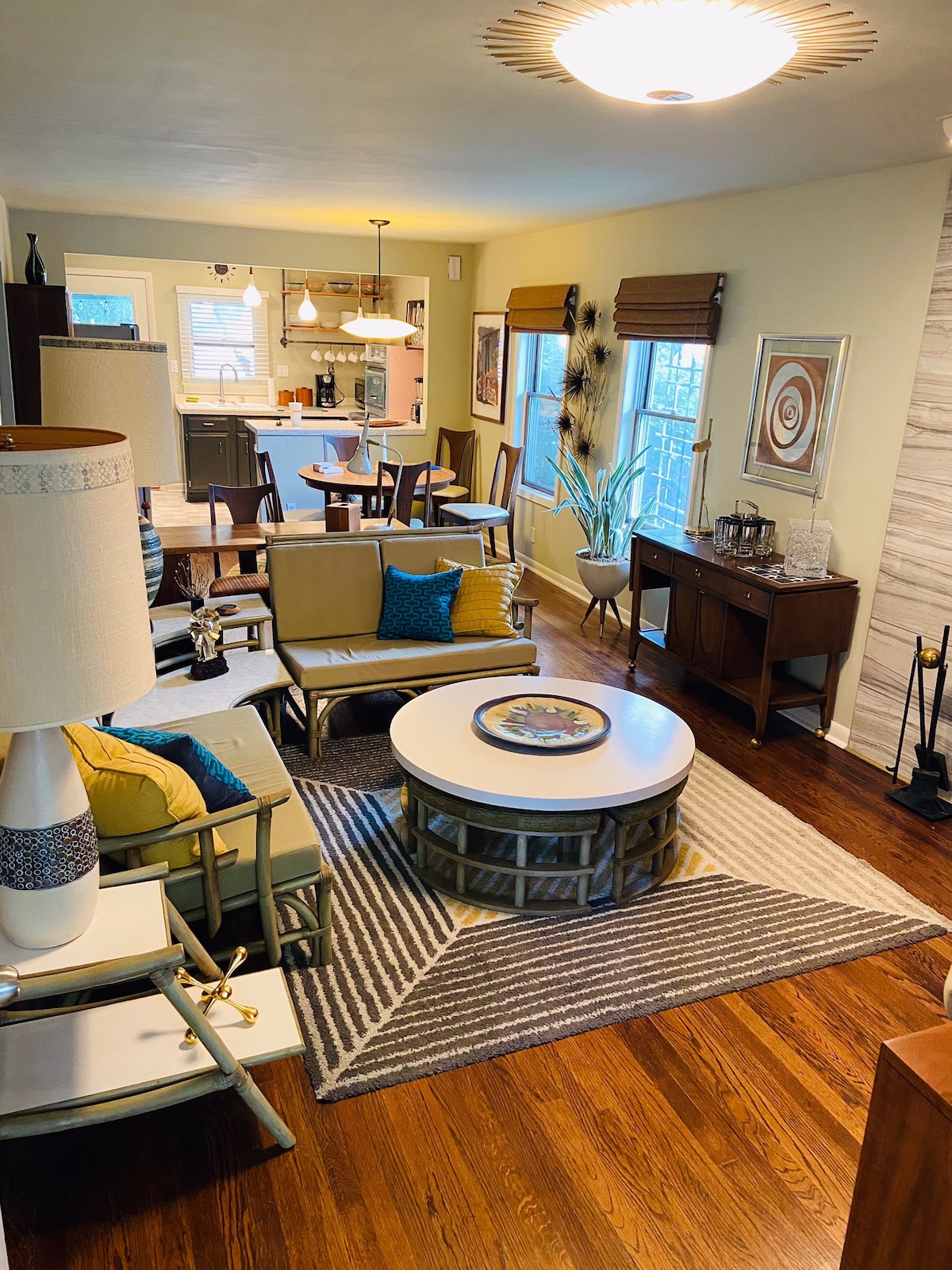 शांत आणि आरामदायक मिड सेंच्युरी थीम असलेला बंगला. ब्रॉयहिल ब्राझीलिया आणि वुडार्ड शिल्पकला फर्निचरमध्ये सुसज्ज. व्हिन्टेज फ्रिगिडेअर फ्लेअर ओव्हन आणि रेंजसह नुकतेच नूतनीकरण केलेले संपूर्ण किचन. गॅस ग्रिल आणि कोळसा ग्रिलसह मोठे कव्हर केलेले डेक. ऑफ - स्ट्रीट पार्किंग आणि सुंदर लँडस्केप केलेली मैदाने. सुट्ट्यांमध्ये मध्य शतकातील उत्सवाच्या सजावटीचा आनंद घ्या. बेन्सन, डुंडी, डाउनटाउन, ब्लॅकस्टोन, मेड सेंटर, ची हेल्थ सेंटर कन्व्हेन्शन सेंटर, क्रायटन आणि चार्ल्स श्वाब फील्डजवळ.