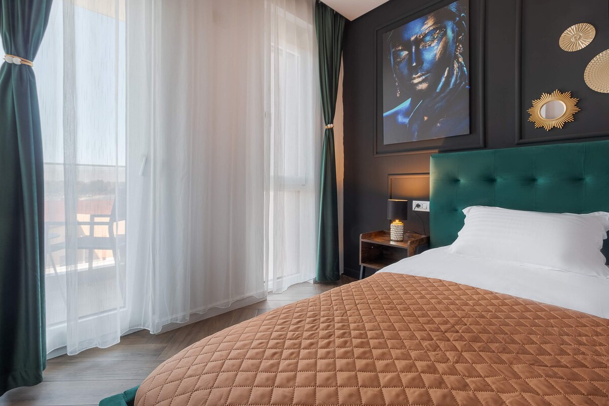 गडद टोन, काळा रंग आणि मोहक सोन्याच्या उच्चारांनी सुशोभित केलेल्या या अप्रतिम अपार्टमेंटमध्ये लक्झरीचा अनुभव घ्या. ओपन - स्पेस लिव्हिंग रूममध्ये 2 प्रौढांसाठी एक उबदार सोफा आहे, जो विश्रांतीसाठी योग्य आहे. वॉक - इन शॉवरचा अभिमान बाळगणाऱ्या स्टाईलिश बाथरूमसह पूर्णपणे सुसज्ज किचन आणि किंग - साईझ बेडरूमचा आनंद घ्या. शहराच्या चित्तवेधक दृश्यांसाठी तुमच्या खाजगी बाल्कनीतून बाहेर पडा. रिझर्व्ह पार्किंग आणि शहराच्या मध्यभागी सहज ॲक्सेससह, फक्त थोडेसे चालणे किंवा 5 - मिनिटांच्या अंतरावर, हे आदर्श शहरी रिट्रीट आहे.