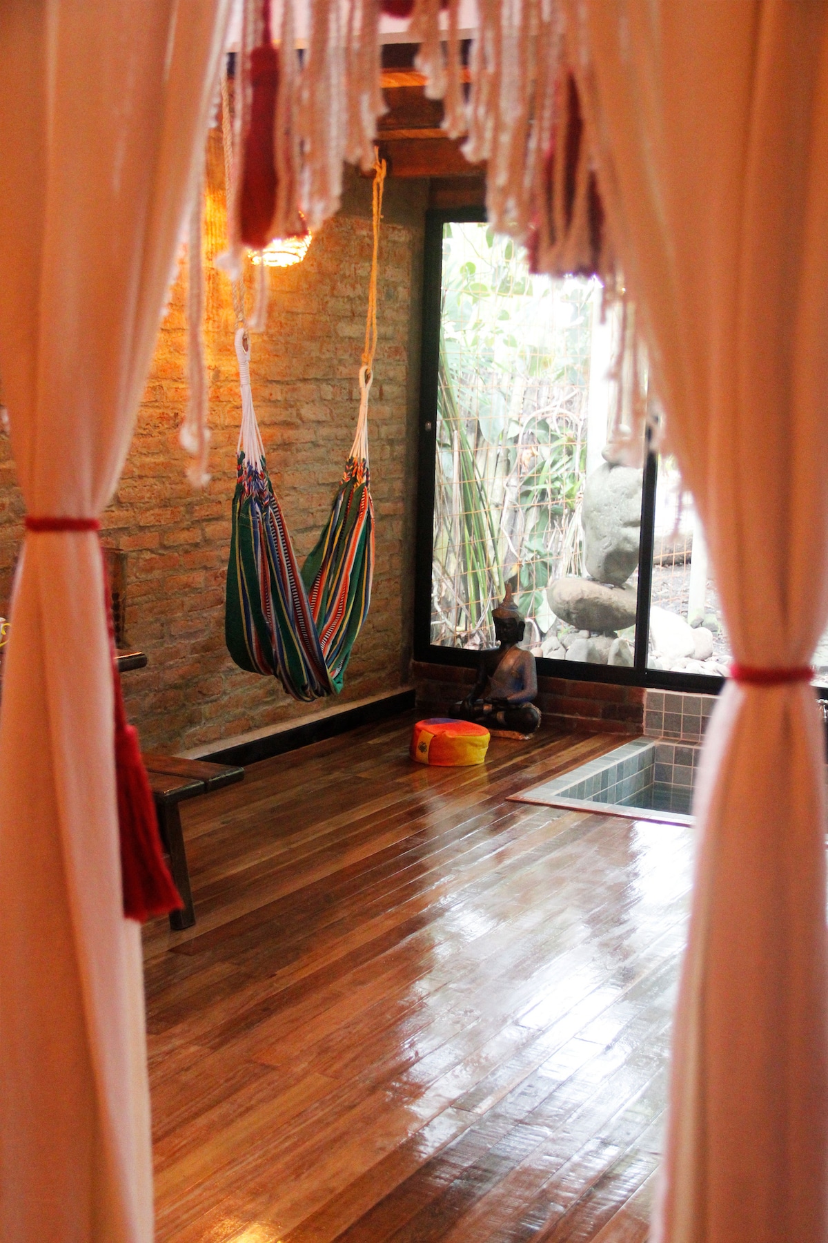 मी वैयक्तिकरित्या तुमच्या आनंद, आनंद आणि आरामासाठी डिझाईन केलेल्या या सुंदर आणि लक्झरी अपार्टमेंटमध्ये तुमचे स्वागत करताना आनंद होत आहे! सर्वात रोमँटिक रात्रींचा आनंद घ्या आणि/किंवा लाकडी मजला, बाथटब आणि खाजगी गार्डनसह, या प्रशस्त आणि आनंददायक आधुनिक अडाणी शैलीच्या निवासस्थानामध्ये शांततेसाठी आणि विश्रांतीसाठी स्वतः ला वागणूक द्या. यात ध्यानधारणेचा सराव करणाऱ्यांसाठी एक आदर्श जागा देखील आहे, तसेच तुमच्या विश्रांतीसाठी आणि एक जोडपे म्हणून आनंद घेण्यासाठी 2 हॅमॉक्स देखील आहेत. यात एक अंतर्गत डायनिंग रूम आहे आणि दुसरी फायर पिटसमोर बागेत आहे.