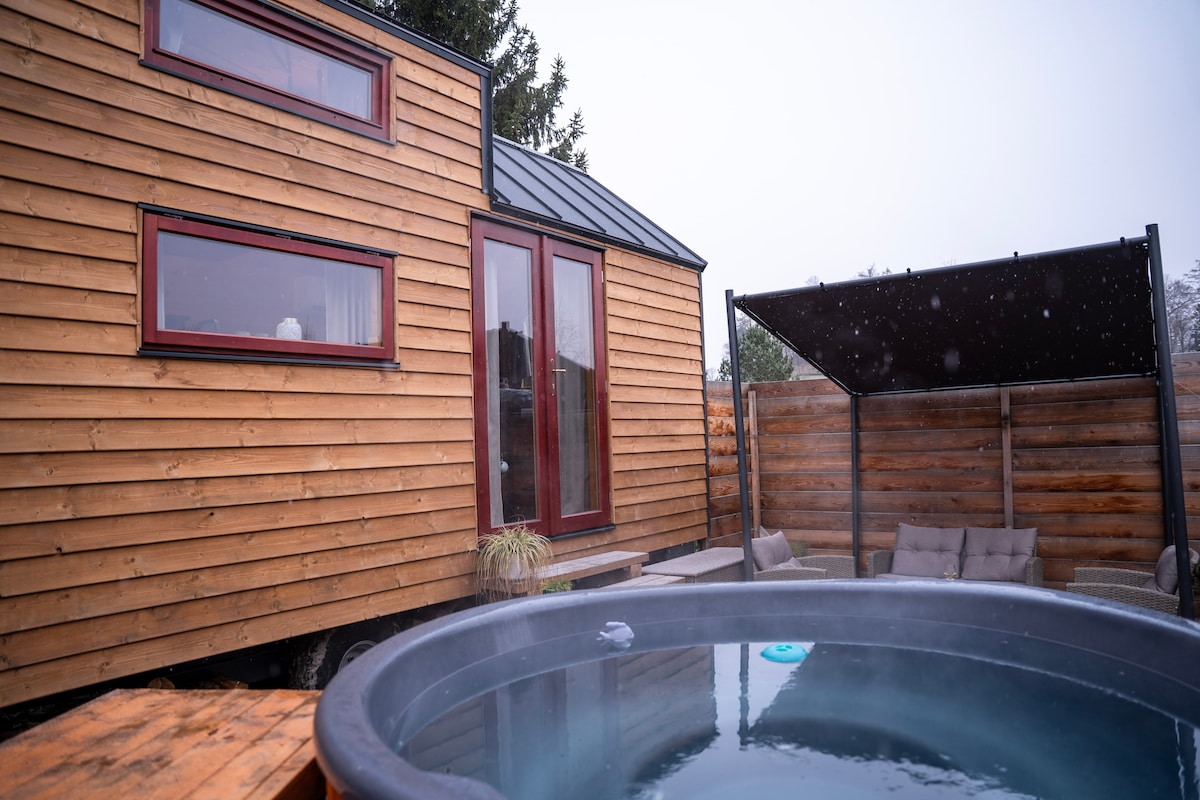 तुम्हाला हे वास्तव्य आवडेल! निसर्गाच्या काठावर एक रोमँटिक लहान घर ज्यामध्ये गरम आंघोळीच्या बॅरलचा समावेश आहे, जिथे तुम्हाला हजारो स्टार्स आणि संध्याकाळी अविस्मरणीय प्रणयाने मोहित केले जाईल. एक पूर्णपणे सुसज्ज घर तुम्हाला आरामदायी वास्तव्यासाठी आवश्यक असलेल्या सर्व गोष्टी ऑफर करते - टीव्ही आणि नेटफ्लिक्स असलेल्या प्रशस्त सोफ्यापासून, संध्याकाळच्या विश्रांतीसाठी योग्य, तुम्हाला आमच्याकडून भेटवस्तू म्हणून मिळेल अशा वाईनच्या बाटलीपर्यंत. तुम्ही या प्रदेशातील सभोवतालच्या सुंदर निसर्गाचा आणि दृश्यांचा आनंद घ्याल. या आणि आराम करा, तुम्ही विसरणार नाही अशी शांती आणि प्रणयरम्य अनुभव घ्या!