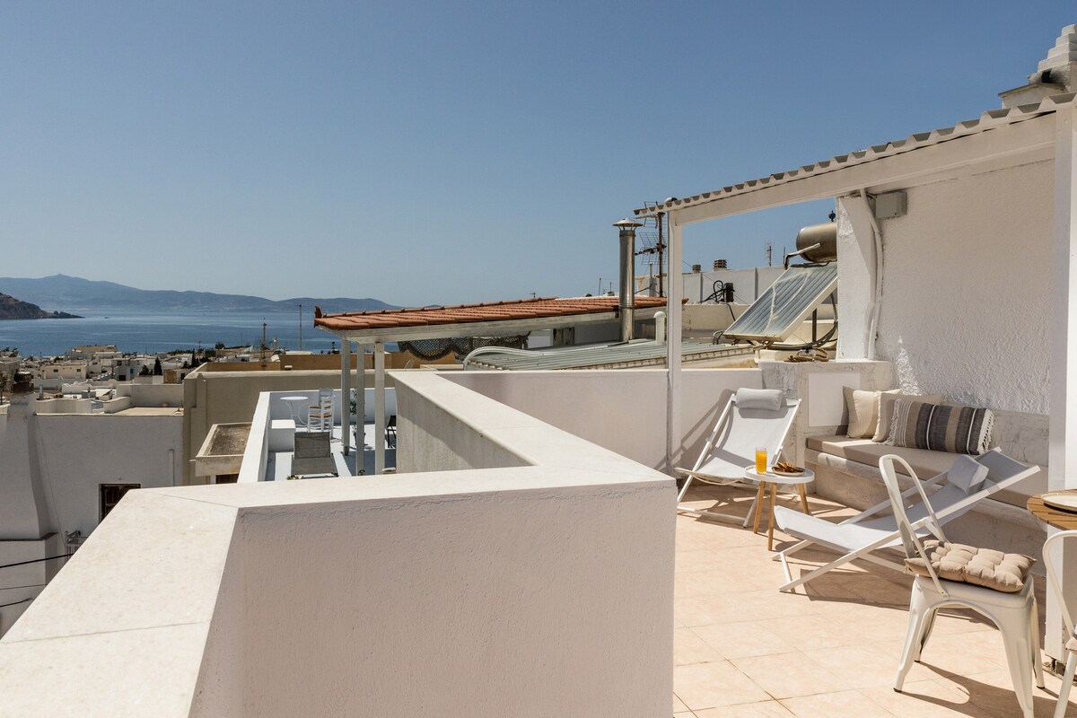 पारिकियामधील प्रमुख लोकेशनमधील सुंदर पेंटहाऊस स्टुडिओ, बीच, रेस्टॉरंट्स आणि दुकानांपासून फक्त 5' अंतरावर आहे. प्रशस्त बेडरूम, बाथरूम आणि ओपन प्लॅन किचन - लिव्हिंग एरियासह पूर्णपणे सुसज्ज, 75 चौरस मीटरच्या खाजगी टेरेसकडे जाते, खाडी, समुद्र आणि पर्वतीय लँडस्केपच्या चित्तवेधक दृश्यांसह. पेय किंवा वाईन आणि अविस्मरणीय सूर्यास्तासह सूर्यप्रकाश, कॉफी किंवा रोमँटिक दुपारसाठी आदर्श. हे सर्व एकत्र करणाऱ्या जागेवरून पारोसच्या आदरातिथ्याचा आणि अनोख्या स्वादांचा आनंद घ्या!