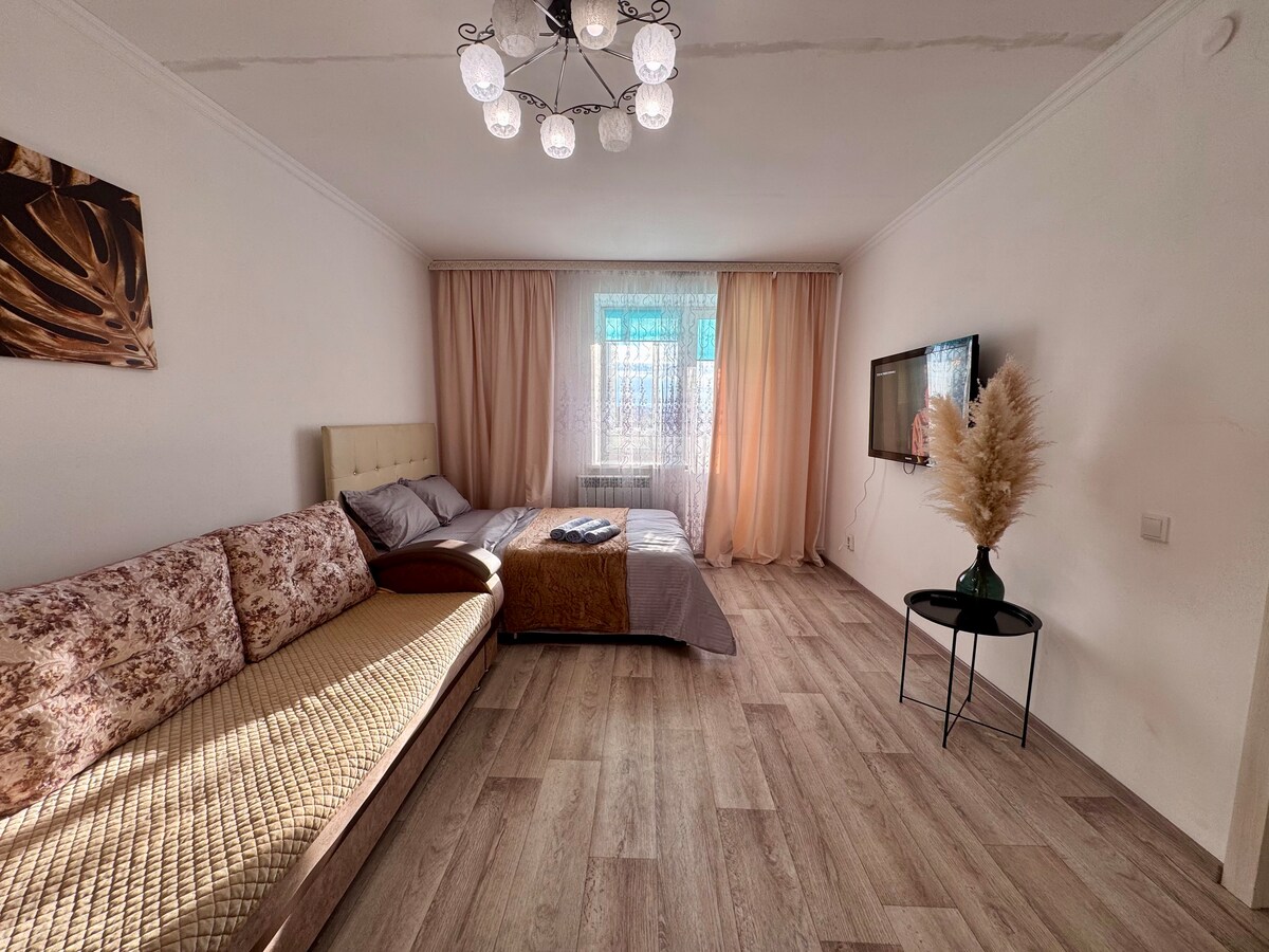 आमच्या शहरातील पहिले आरामदायक अपार्टमेंट, जिथे तुम्ही केवळ आराम करू शकत नाही तर माशांची प्रशंसा देखील करू शकता. डाउनटाउन, शांत आसपासच्या परिसरात. तुमच्या आरामदायी वास्तव्यासाठी सर्व काही आहे. स्मार्ट टीव्ही, वायफाय, Ivi सबस्क्रिप्शन. खुर्ची फोल्ड होत असताना 2 प्रौढ आणि एक मूल सामावून घेणे शक्य आहे. आम्ही तुमचे स्वागत करण्यास उत्सुक आहोत!