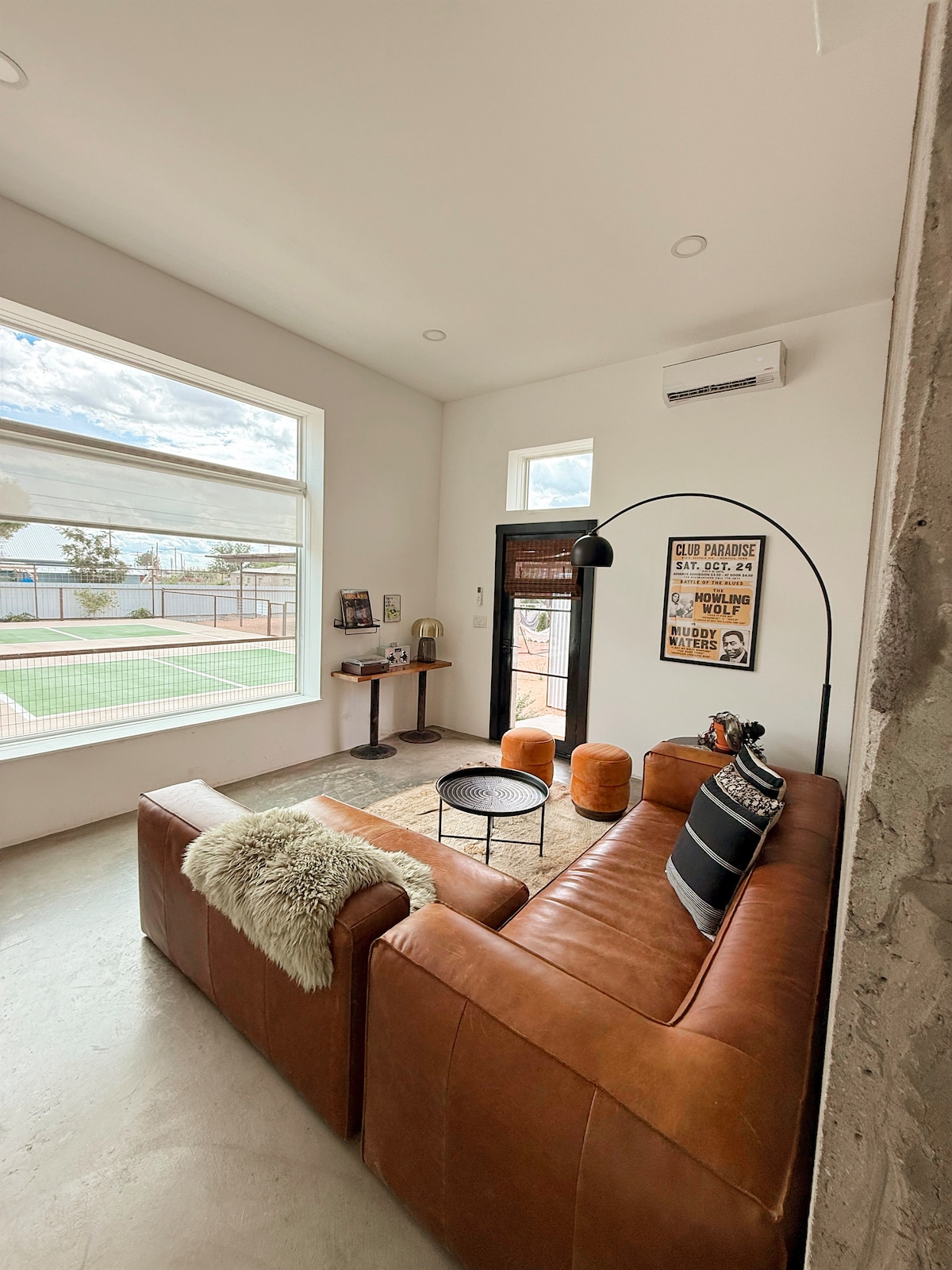 At the western end of Bohemio's Raconteur Lodge, the Western Sky Suite boasts a luxurious bedroom, tall ceilings, uniquely grand glass doors, comfy seating, and a kitchen filled with simple utilitarian delights. This suite in Marfa stands out, blending the essence of adobe architecture with modern elegance and a touch of contemporary design. The private patio is the largest at the lodge, and opens directly onto the spacious backyard, and Pickleball Paddle Club.