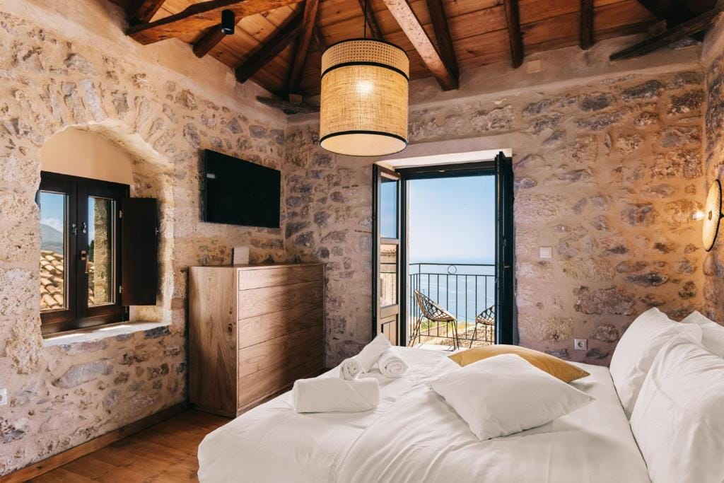 घर 135 चौरस मीटर आहे आणि त्यात 4 बेडरूम, लिव्हिंग रूम, किचन, फायरप्लेससह एकच जागा, 2 बाथरूम आणि 2 बाल्कनी आहेत. संपूर्ण जेवण तयार करण्यासाठी आवश्यक असलेल्या सर्व भांड्यांनी सुसज्ज आहे (किचन - फ्रीज - केटल - टोस्टर). यामध्ये 8 लोकांना सामावून घेता येते. बाथरूम आणि फ्रीजसह डबल रूममध्ये उर्वरित घरापासून स्वायत्ततेची शक्यता आहे. तळमजल्यावर आमचे पारंपरिक टॅव्हर्न "पॅरालिया" आहे आणि लाकोनियन भूमीचे पारंपरिक खाद्यपदार्थ चाखण्यासाठी ते तुमची वाट पाहत आहे.