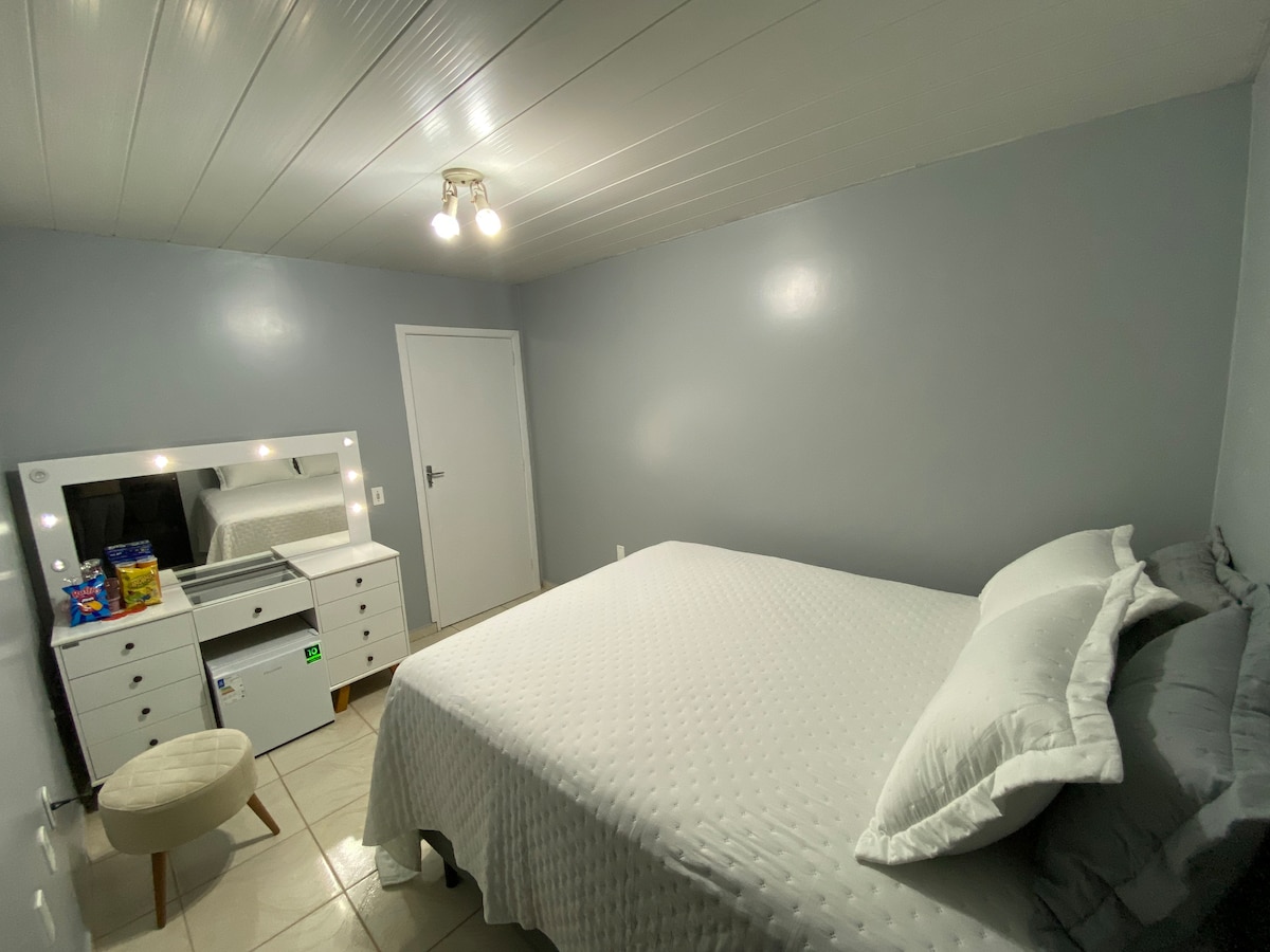A suíte possui uma cama de casal, é aconchegante e confortável com ar condicionado, televisão e acesso a Wi-Fi. A casa conta com cozinha compartilhada onde é servido o café da manha, juntamente com outros hóspedes e os proprietários. Possuímos 2 pets em casa, dóceis e acostumados com pessoas. A casa fica a 250 metros do mar, no centro de piçarras. Nas proximidades há farmácia, mercado, restaurante e panificadora. Servimos um café da manhã como cortesia para nossos hóspedes.
