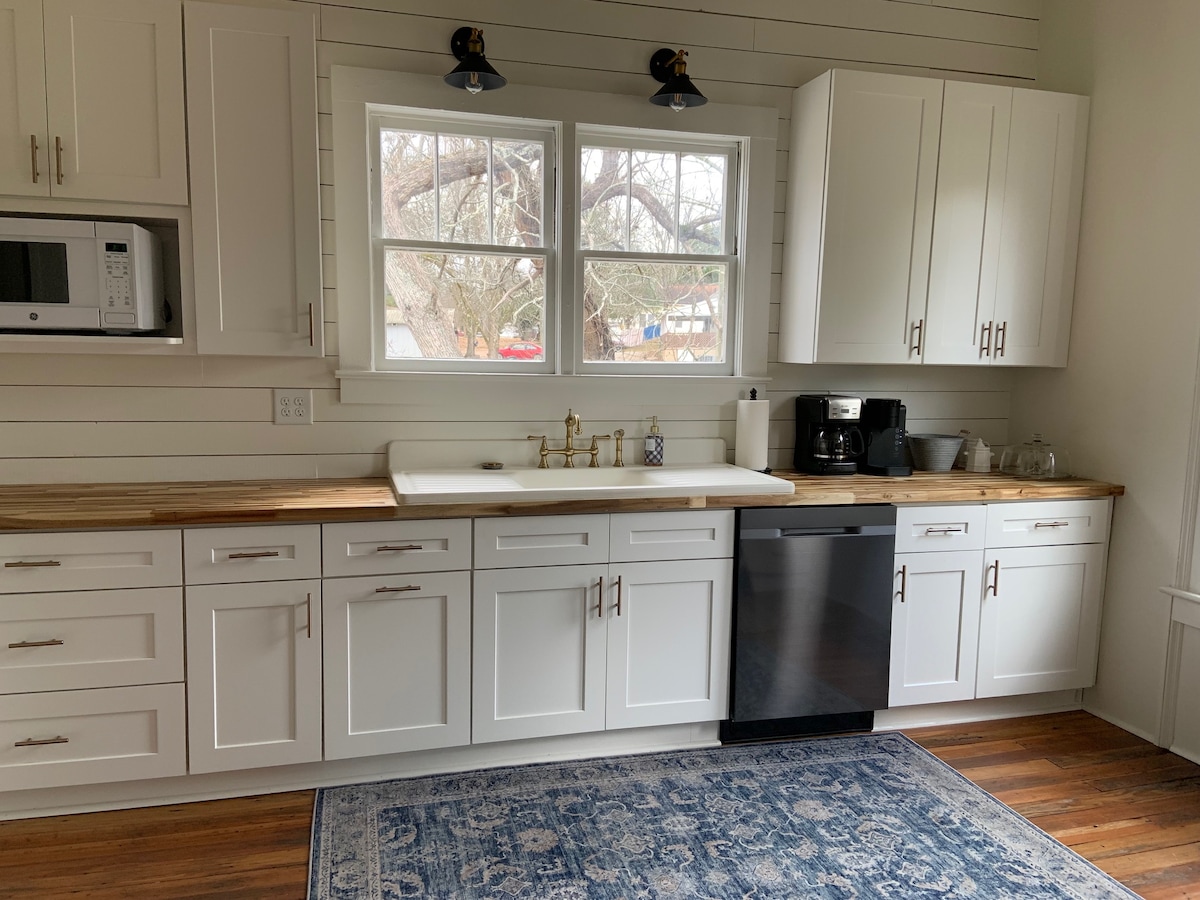 आमच्या 1914 च्या ताज्या नूतनीकरण केलेल्या फार्महाऊसमध्ये शांत आणि अनोख्या वास्तव्याचा आनंद घ्या. या गोड सौंदर्यामध्ये डोक्यापासून पायापर्यंत मेकओव्हर झाला आहे आणि ती तिचा नवीन लुक तुमच्याबरोबर शेअर करण्यास तयार आहे. वेल हाऊस आमच्या लहान परंतु वाढत्या शहराच्या मध्यभागी आहे आणि दैनंदिन गरजांसाठी तसेच आसपासच्या परिसरातील अनेक स्थानिक आकर्षणांसाठी सोयीस्करपणे स्थित आहे. समोरच्या पोर्चमधून तुम्ही चहा पिऊ शकता आणि असा विश्वास ठेवू शकता की तुम्ही देशाबाहेर आहात आणि व्हिन्टेज बॅक पोर्चमधून तुम्हाला जीवनाची टाऊन साईडचा अनुभव येतो.