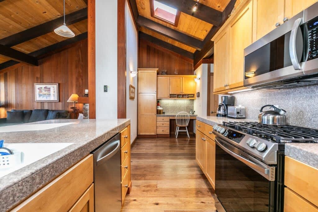 उबदार आणि उबदार स्टुडिओ काँडो; 2 प्रौढ/2 मूल किंवा 3 प्रौढांसाठी आदर्श. स्टुडिओ 432 चौरस फूट आहे. किंग्ज बीच/लेक टाहोपासून 2 मैल. नॉर्थस्टार स्की रिसॉर्टपर्यंत 6 मैल आणि टाहो रिम ट्रेल्सपर्यंत .5 मैल. स्टुडिओमध्ये गॅस फायरप्लेस, Apple TV, फास्ट वायफाय, केबलसाठी यूट्यूब टीव्ही, ग्रॅनाईट काउंटरटॉप्स, चहा किंवा हॉट चॉकलेटसाठी तात्काळ गरम पाणी, मोशन नळ, तळमजला युनिट, ॲडिरॉंडॅक खुर्च्यांसह पॅटिओ आहे. काँडो क्लबहाऊस/स्विमिंग पूल (हंगामी), हॉट टब वर्षभर खुले असते, पूल टेबल, पिंग पोंग, फायरप्लेस आणि गेम्स.