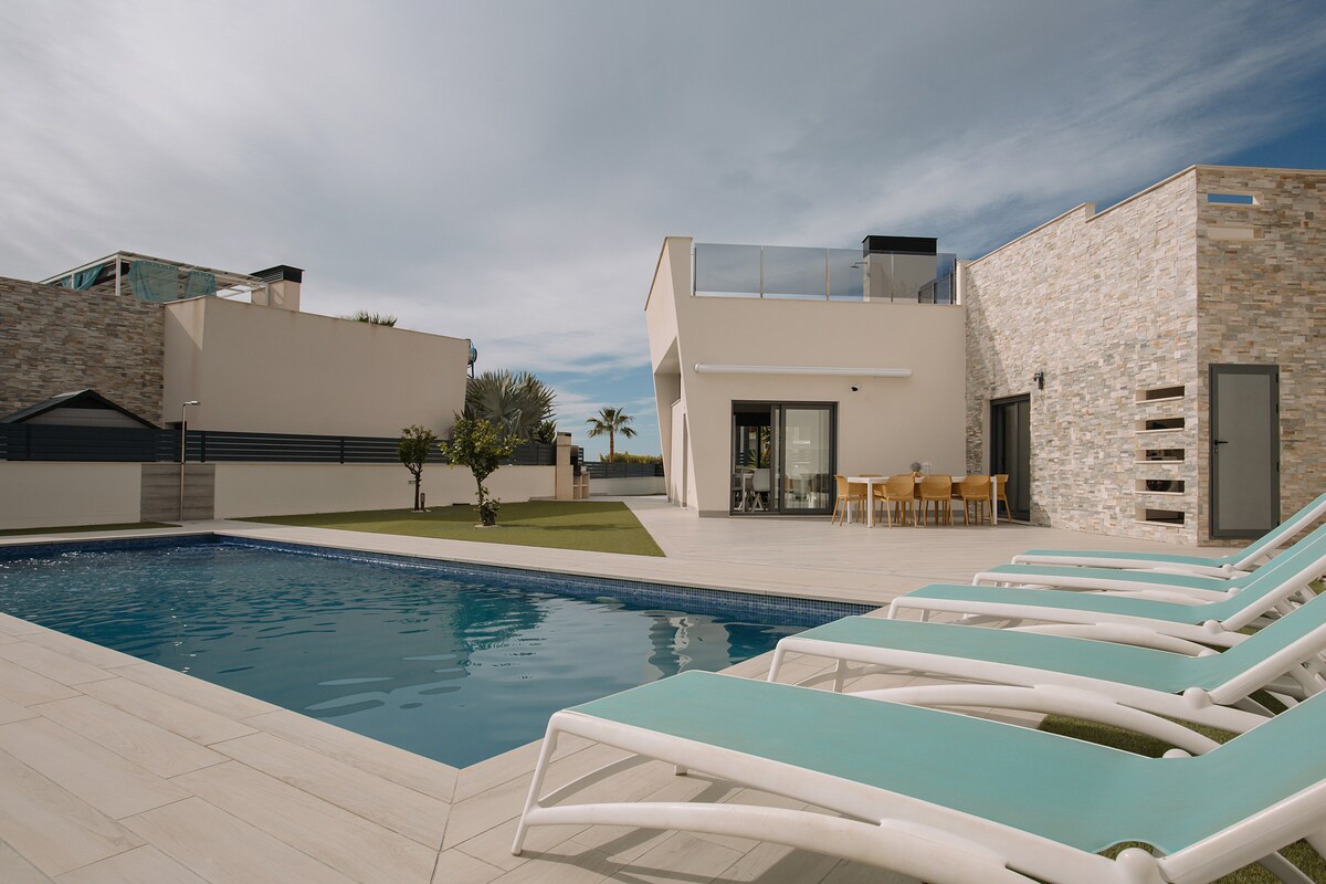 खाजगी आणि मोठ्या 10X4m पूल, मोठी टेरेस आणि सोलरियमसह प्रशस्त 550sqm प्लॉटवर भव्य 3 बेडरूमचा व्हिला. समुद्रावर आणि बेनिडॉर्मच्या आकाशावरील पॅनोरॅमिक दृश्ये. आमचे प्रीमियम ओसिस ला फॅमिलीया धोरणात्मकदृष्ट्या अलेक्सेंटच्या आंतरराष्ट्रीय विमानतळाच्या उत्तरेस 35 मिनिटांच्या अंतरावर, बेनिडॉर्मचे सुप्रसिद्ध आणि उत्साही शहर आणि फिनस्ट्रॅटच्या सामान्य स्पॅनिश गावाच्या दरम्यानच्या पर्वतांमध्ये स्थित आहे.