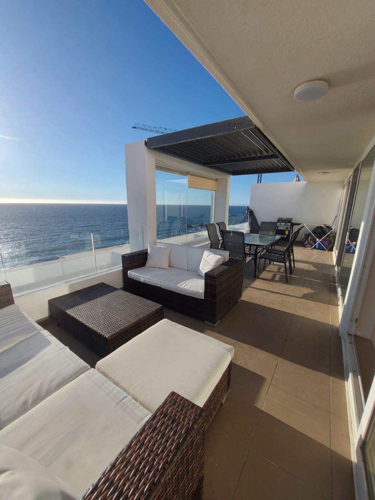 Acogedor departamento de 2D y 2B, en 1ra línea y con gran terraza de inmejorable vista a la bahía de Valparaíso. A pasos de la playa de Reñaca y cerca de excelentes restaurantes, ciclo-vías, miradores y supermercados. El depto. es full eléctrico (cocina, calefacción, agua caliente, etc.) y está en un piso 4. Estacionamiento techado con control remoto. El edificio cuenta con 2 ascensores, conserjería y seguridad 24h.