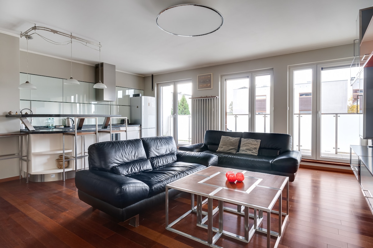 राहण्याची आणि आराम करण्याची जागा. कुटुंब आणि बिझनेस ट्रिप्ससाठी. मॉल आणि एअरपोर्टपासून थोड्या अंतरावर. जवळच बसस्टॉप आहे. बंद हाऊसिंग इस्टेटचा भाग म्हणून अपार्टमेंट. बिल्डिंगमध्ये विनामूल्य जिम आणि किंडरगार्टन. आसपासच्या परिसरात अनेक दुकाने, बेकरी, रेस्टॉरंट्स, ब्युटी सलून्स किंवा स्पोर्ट्स रूम आहेत.