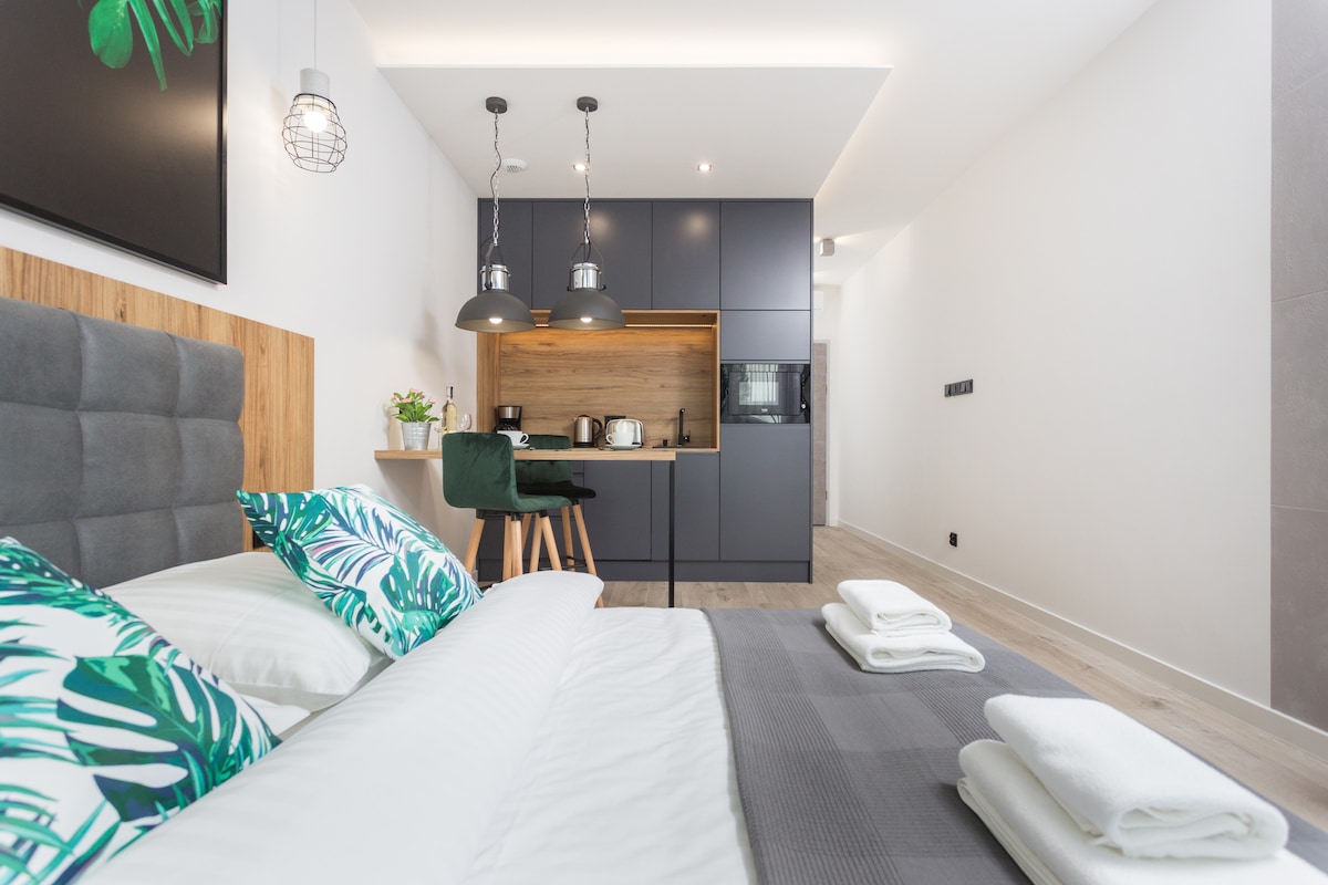ओल्ड टाऊन अपार्टमेंट चमिएल्ना पार्क हे 43 चौरस मीटर क्षेत्रफळाचे आधुनिक, आरामदायक अपार्टमेंट आहे. हे जास्तीत जास्त 4 लोकांसाठी डिझाइन केलेले आहे. पाहुण्यांसाठी सोफा बेड आणि एलसीडी टीव्हीसह लिव्हिंग रूम, पूर्णपणे सुसज्ज किचनेट, मोठा, आरामदायक बेड असलेली बेडरूम आणि शॉवरसह बाथरूम आहे. अपार्टमेंटमध्ये बाल्कनी आणि भूमिगत गॅरेजमध्ये विनामूल्य पार्किंगची जागा आणि वायफायचा वापर आहे. लिव्हिंग रूम आणि बेडरूममध्ये दूरस्थ कामासाठी 2 स्वतंत्र जागा आहेत.