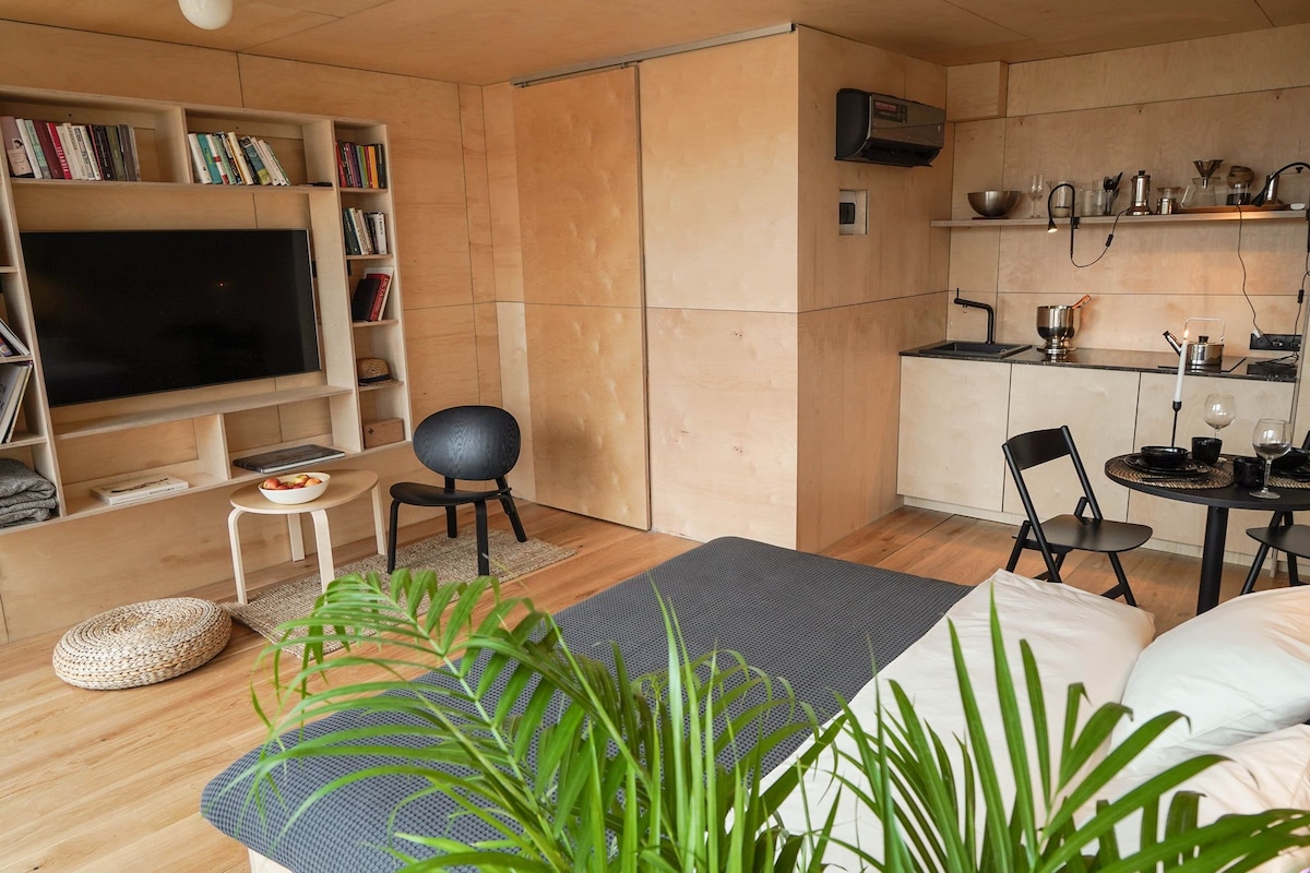 Tiny House in the forest with a tarrace awakes a sense of merging with the woods - hundreds of meters of nature feel like in your room thanks to glass walls. Bikes and SUPs available. Lots of running trails. 10 min to the Sielanka riding school. 12 min to Kazimierz Pułaski Park and Museum. 60 min from Warsaw, 3 km from the Pilica River, perfect for kayaking.