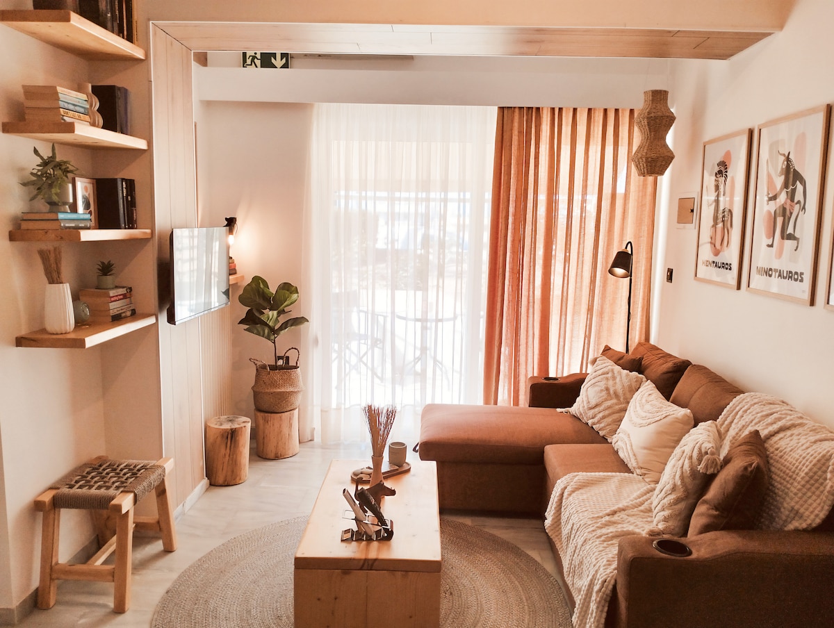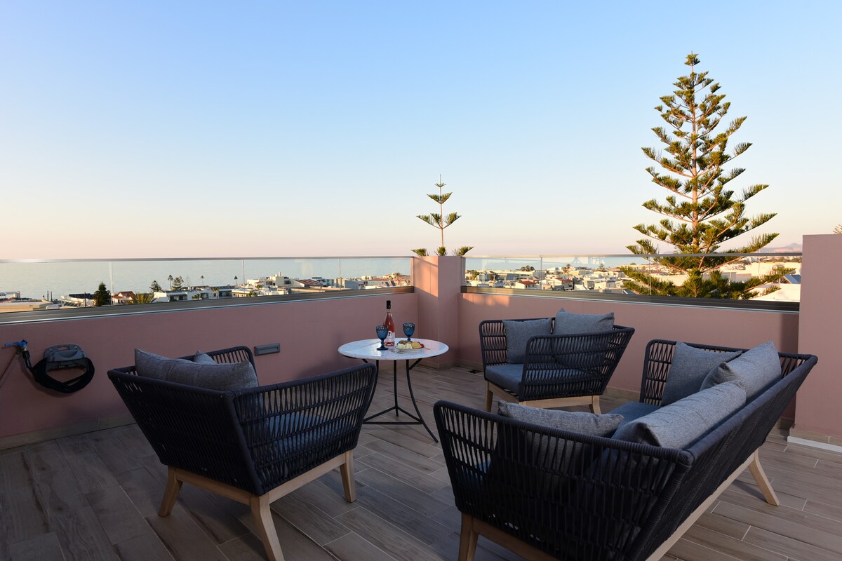 ला व्हिए एन मेर अपार्टमेंट्सच्या लक्झरी सीव्हिज स्टुडिओमध्ये तुमचे स्वागत आहे, हा रेथिम्नोमधील तुमच्या उन्हाळ्याच्या सुट्टीसाठी आदर्श पर्याय आहे. या अप्रतिम ग्रीक बीचसाईड अपार्टमेंटमध्ये विश्रांती घ्या. आमचे घर आलिशान पण मोहक भावनेसाठी मातीचे रंग, बोहो तपशील आणि अगदी नवीन इलेक्ट्रॉनिक उपकरणांनी प्रेमळपणे बांधलेले होते. किल्ला आणि सूर्यास्ताचे अप्रतिम दृश्य दाखवणाऱ्या आमच्या मोठ्या बाल्कनीतून समुद्राचा आणि शहराच्या दृश्यांचा आनंद घ्या. हे घर वाळूपासून 10 मीटर अंतरावर रेथिम्नोच्या बीच रोडवर आहे.