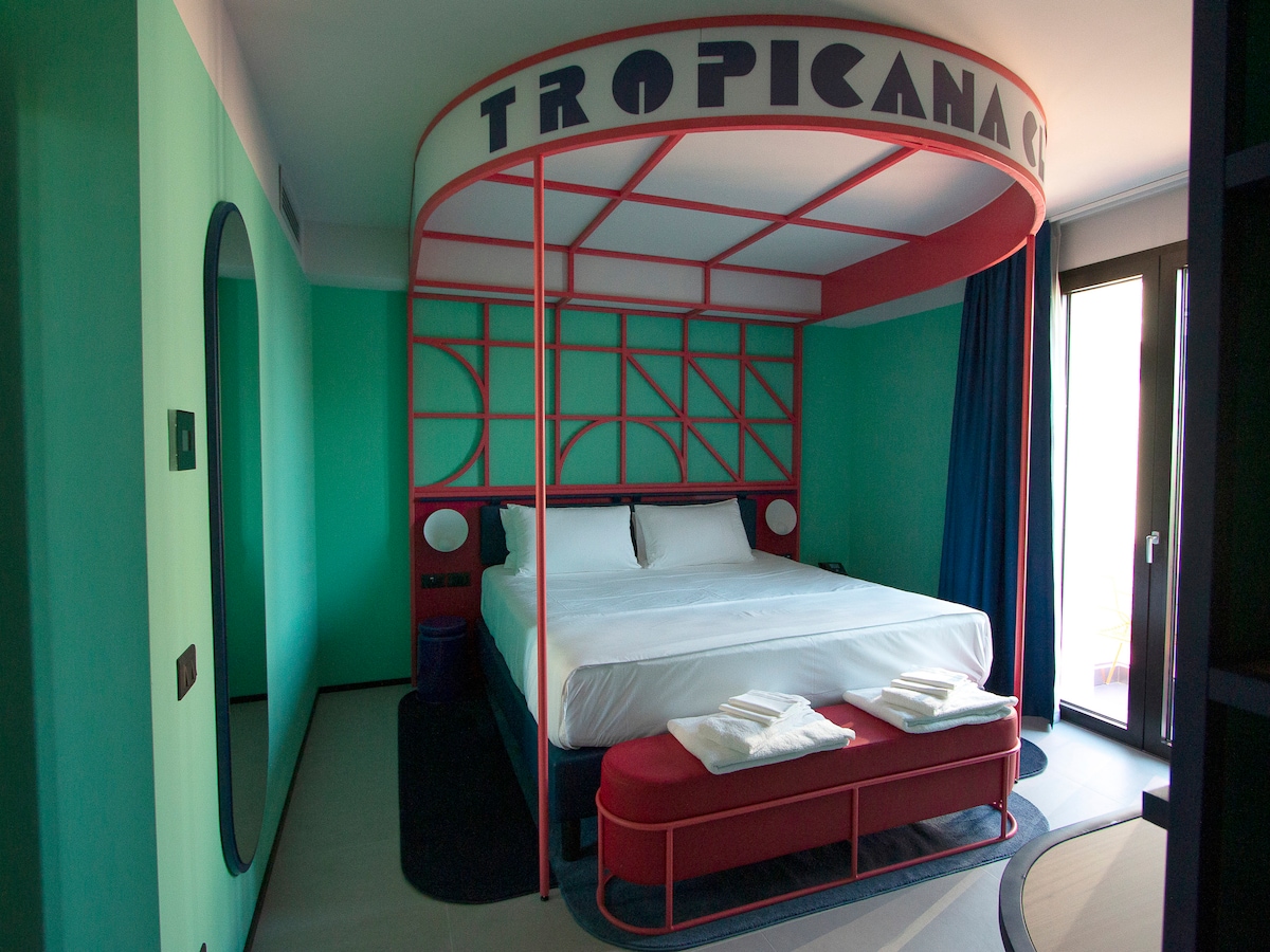 Questa Suite racconta una storia fatta di divertimento e colori accesi: è una camera non convenzionale, con accenni tropicali, che ammicca gioiosamente agli anni ‘80. Due ambienti separati condividono la stessa estetica pop: la zona living prevede un vero e proprio angolo bar, mentre la zona notte è dominata dal grande letto, citazione di un baldacchino, che unisce elementi grafici e materiali metallici.