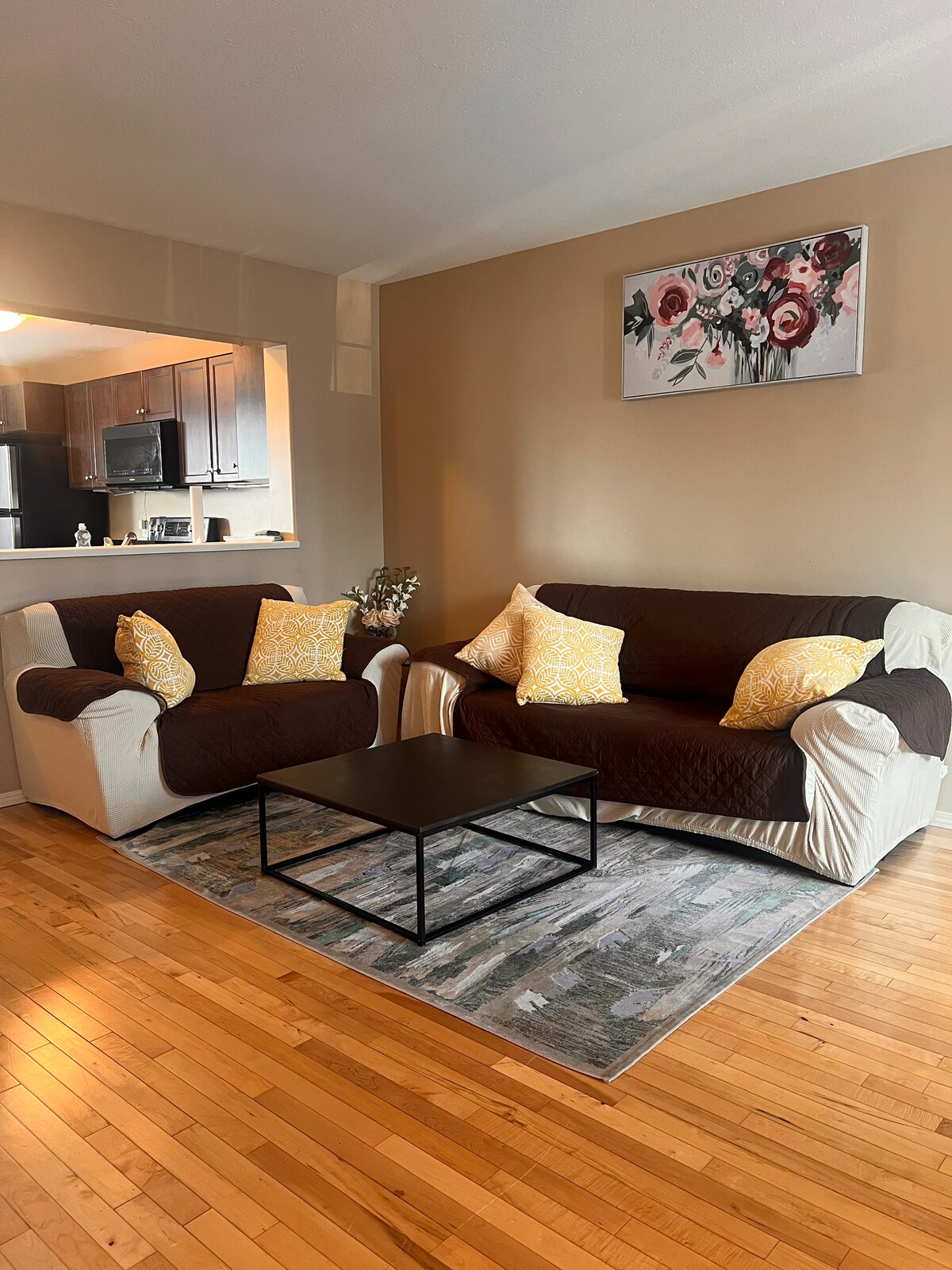 1 बेडरूम क्वीन साईझ बेड, खाजगी बाथरूम आणि पूर्ण किचनसह संपूर्ण बेसमेंट सुईट. पुल आऊट बेडसह लिव्हिंग रूम. रेस्टॉरंट्स, फार्मसी आणि सर्व्हस स्पोर्ट्स कॉम्प्लेक्सजवळ सोयीस्करपणे स्थित. होस्ट/मालक त्यांच्या 2 वर्षांच्या बाळासह आणि 2 सुंदर फर बाळांसह घराच्या मुख्य मजल्यावर राहतात. पायऱ्यांचा आवाज ऐकू येण्याची अपेक्षा करा. इअर प्लग दिले गेले आहेत. तुम्हाला काही हवे असल्यास आम्ही लगेच तुम्हाला मदत करू.