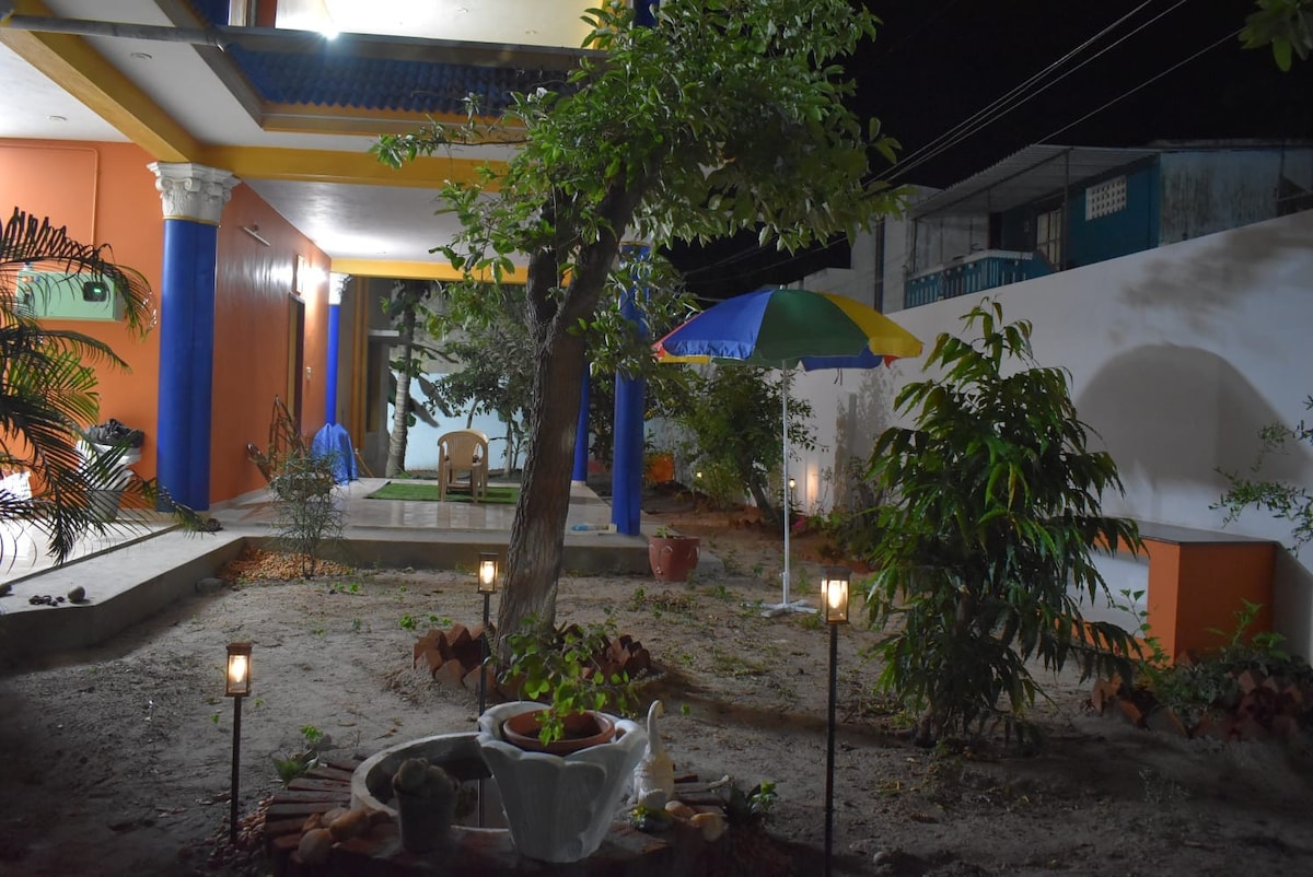 Relax with your family or friends at our peaceful 2BHK house, just 100 meters from Serenity Beach. Enjoy two air-conditioned bedrooms with attached bathrooms and water heaters, a cozy living room with a Smart TV, an open kitchen, indoor games, Wi-Fi, UPS backup, BBQ setup, campfire, garden seating, open shower, and a spacious terrace—all with 24/7 front desk support. It’s the perfect setting for a memorable beachside getaway. Your peaceful escape starts here!