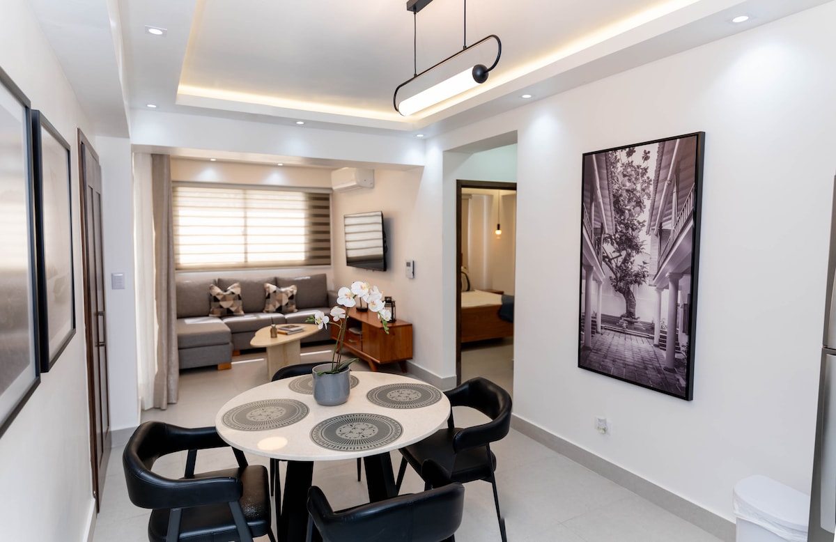 1. Comfortable & nice bedrooms 2. Strong-fast WIFI 3. A great pool 4. Hot water 5. Netflix 6. Nice balcony 7. Minimarket available w/delivery 8. Practical kitchen with its equipment 9. Modern washing machine & drier (Free) 10. It is 3 minutes from banks. 11. It is 15 minutes from Cibao International Airport and Santiago City. 12. Iron area available 13. Basketball court 14. TV only main room. 15. Cleaning service during the stay (with a fee). 15. Give you a chance to enjoy a cozy experience.