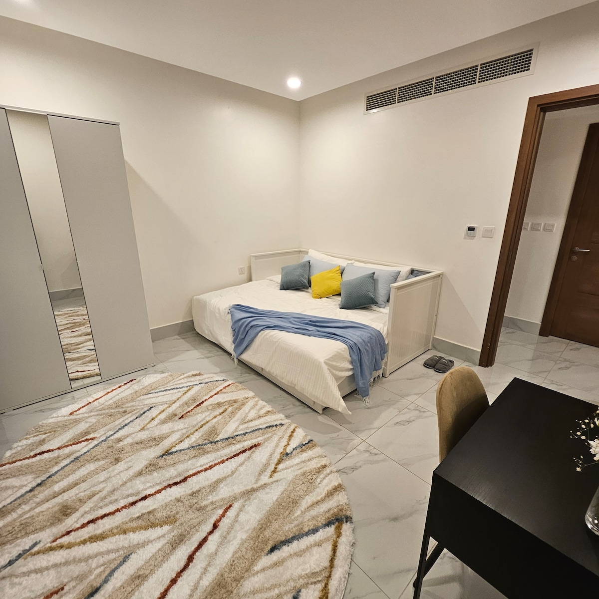 बाल्कनी, लिव्हिंग एरिया आणि 2 टॉयलेट्ससह नवीन 1 बीडी फ्लॅट. नाईस फर्निचर. हाय स्पीड वायफाय, बेड आणि ड्रेसिंग,सोफा, 50 इंच स्मार्ट टीव्ही, उपग्रह आणि विनामूल्य नेटफ्लिक्स ॲक्सेस, इस्त्री मशीन, हेअर ड्रायर,व्हॅक्यूम क्लीनर, डक्ट एसी, एलईडी स्पॉट लाइट्ससह सीलिंगसह सुसज्ज. तुम्ही विनामूल्य स्विमिंग पूल, जिम आणि मुलांचे खेळाचे मैदान आणि बार्बेक्यू कुकिंग एरियाचा आनंद घेऊ शकता. शॉपिंग मॉलपासून 5 मिनिटांच्या अंतरावर, विमानतळापासून 15 -20 मिनिटांच्या अंतरावर. बीचपासून 20 मिनिटांच्या अंतरावर, जुन्या मार्केटपासून 20 मिनिटांच्या अंतरावर, वाळूच्या ढिगाऱ्याच्या दृश्याच्या बाजूला.