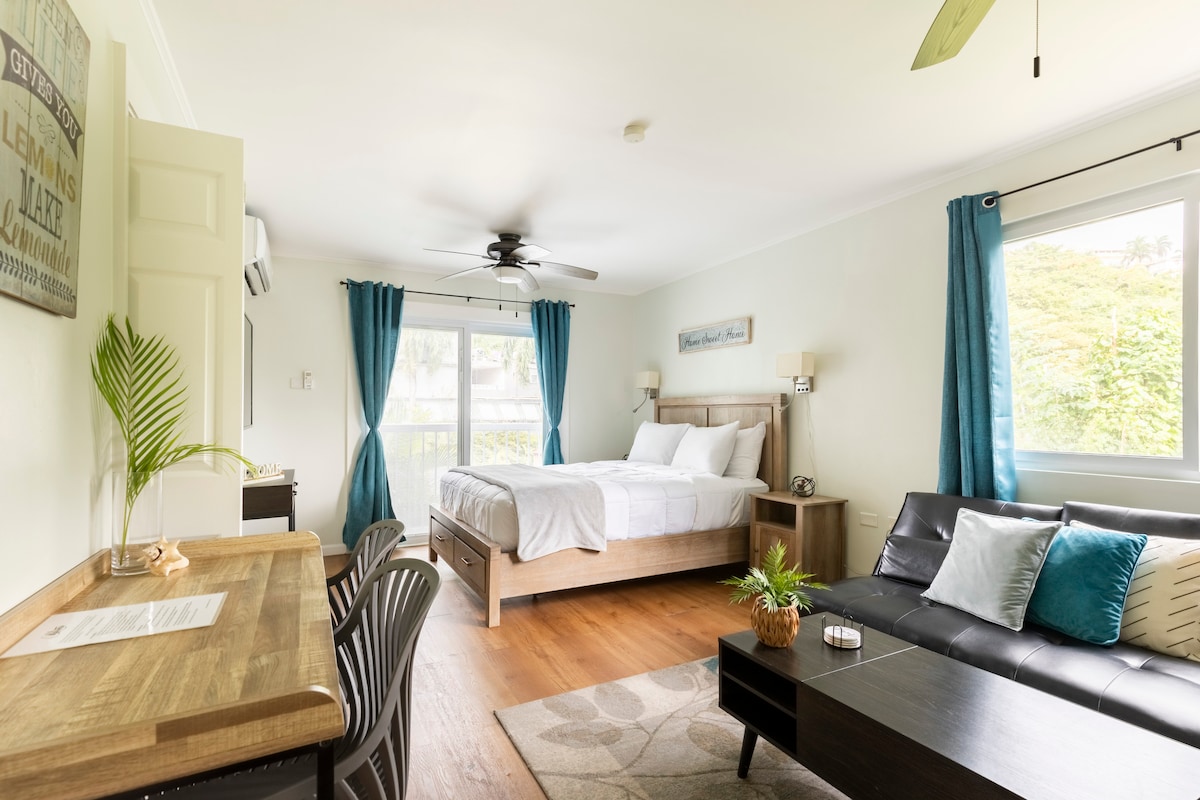 परिपूर्ण वास्तव्यासाठी तुम्हाला आवश्यक असलेल्या सर्व आधुनिक सुविधांसह आधुनिक, 1BR, ग्राउंड लेव्हल अपार्टमेंट. विस्मयकारक किनारपट्टी आणि टर्क्वॉइज लगूनकडे पाहत पॅटीओवर कॉफी घेत तुमचा दिवस सुरू करा. ही प्रॉपर्टी एका सुरक्षित, गेटेड डेव्हलपमेंटचा भाग आहे ज्यात खाजगी कम्युनिटी पूल आहे जो गेस्ट्सना त्यांचा टॅन परिपूर्ण करताना आराम करू शकेल किंवा कोल्ड ड्रिंकवर सावलीत लपून राहू शकेल. तुम्ही एअरपोर्ट, शॉपिंग मॉल आणि नाईटलाईफच्या पुरेसे जवळ आहात - परंतु शांत विश्रांतीसाठी बाहेरील भागात वसलेले आहात.