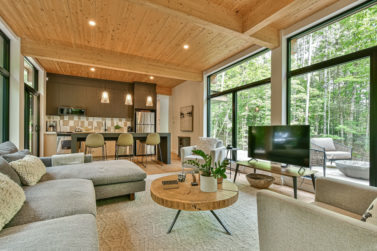 Contact us for our On-going Promotion! Skÿe Tremblant is a private, Luxury Glass Cabin & Spa escape on the Tremblant mountainside. The cabin is majestically glazed architectural space combining natural simplicity and contemporary luxury, 10 min from village of Mont-Tremblant and Ski Mont-Tremblant. On the end of the cliff, in the treetops with a fully glazed living space, enjoy the Panoramic terrace, hot tub for relaxation experience. In shared domain of 1200 Acres. Renowned Canadian Designer.