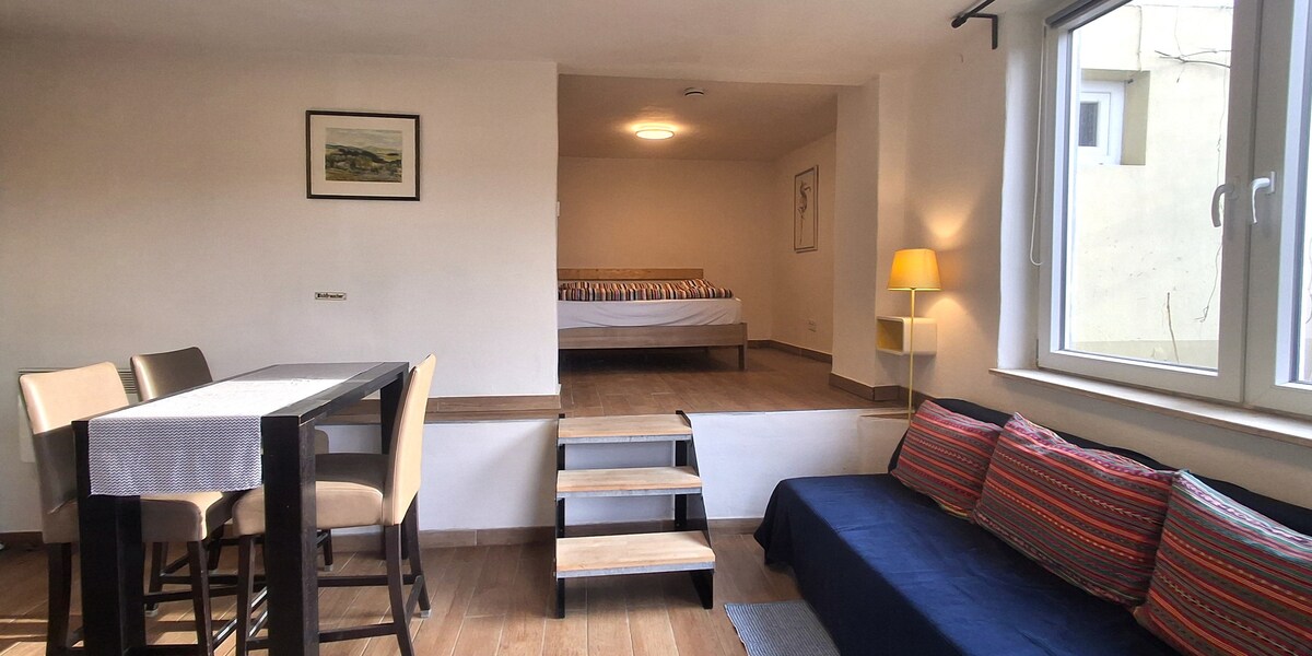 अपार्टमेंट सुमारे 30 चौरस मीटर आहे. हे तळमजल्यावर आहे, त्याचे स्वतःचे घराचे प्रवेशद्वार आहे आणि बागेचा दरवाजा आहे समोरच्या भागात शॉवर रूम आणि लिव्हिंग आणि वर्किंग रूम आहे ज्यात एक मोठे, विस्तार करण्यायोग्य डायनिंग आणि डेस्क आहे, ज्यात आर्मचेअर, शेल्फ्स आणि स्टोरेज सुविधा आणि टीव्ही आहे. वायफाय विनामूल्य उपलब्ध आहे. मागील बाजूस, बागेच्या समोर बेडरूम आणि पूर्णपणे सुसज्ज किचन आहे. बाथरूम आणि लिव्हिंग रूम्सचे नुकतेच नूतनीकरण केले गेले आहे आणि नुकतेच सुसज्ज केले गेले आहे.